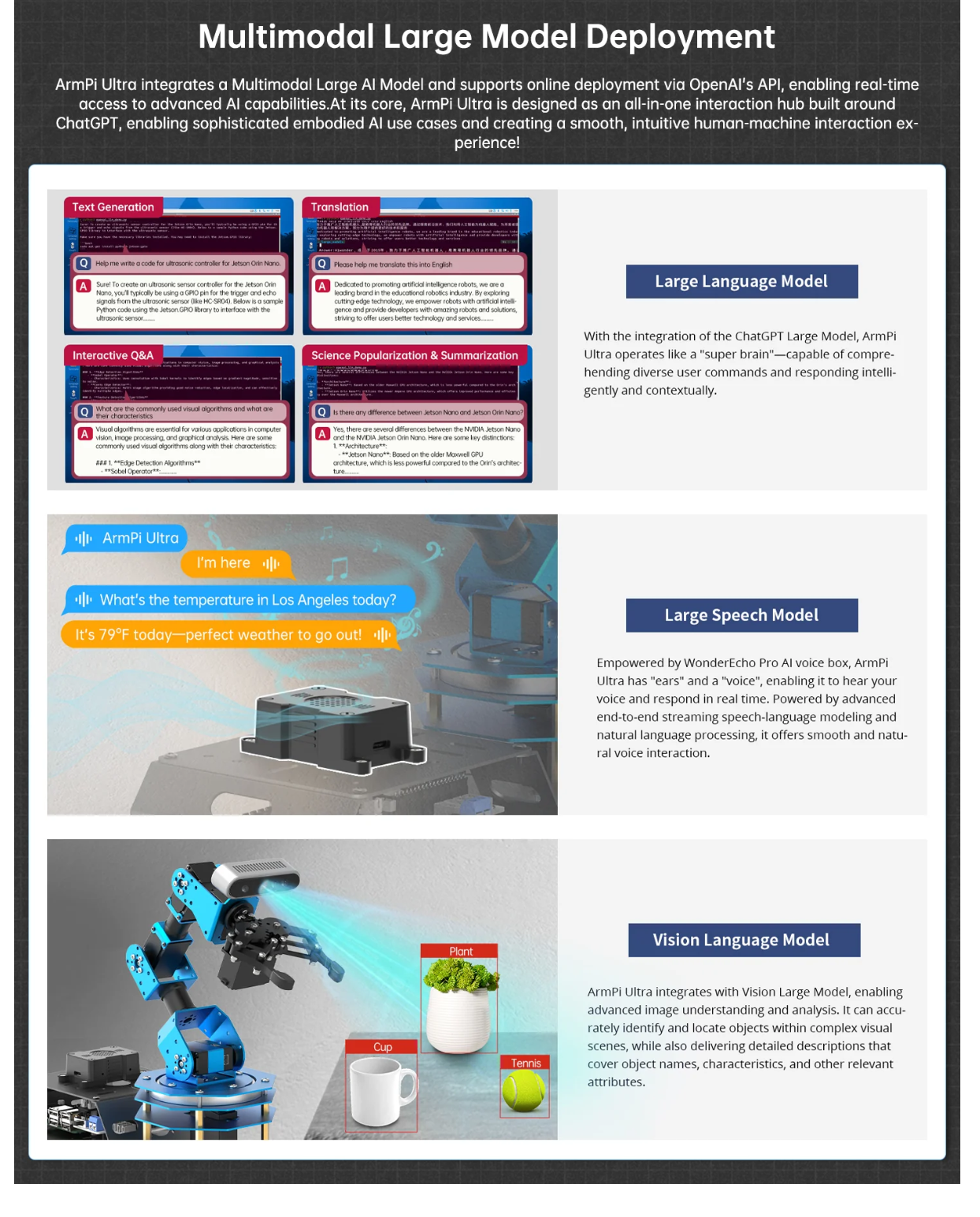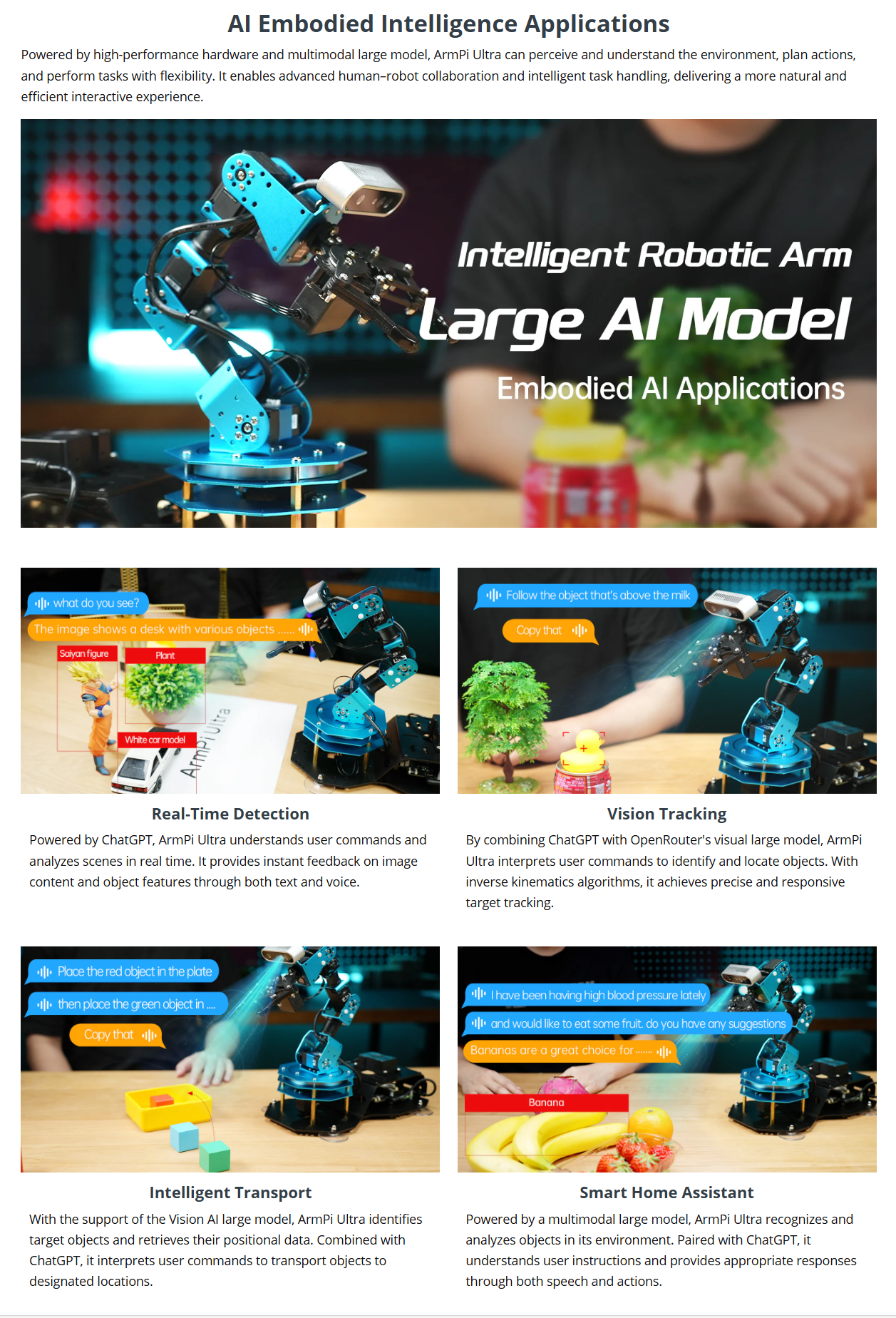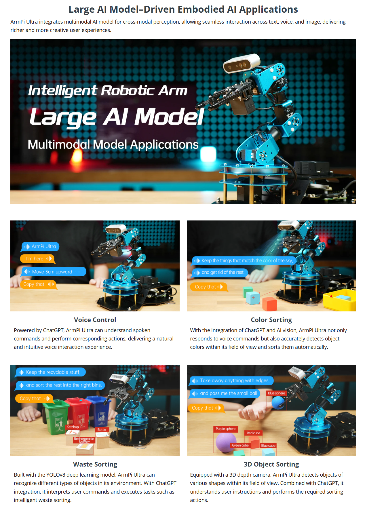 • AI Embodied Intelligence and Human-Robot Interaction: ArmPi Ultra leverages multimodal large AI Models to create an interactive system centered around ChatGPT. Paired with its 3D vision capabilities, ArmPi Ultra boasts outstanding perception, reasoning, and action abilities, enabling more advanced embodied AI applications and delivering a natural, intuitive human-robot interaction experience.