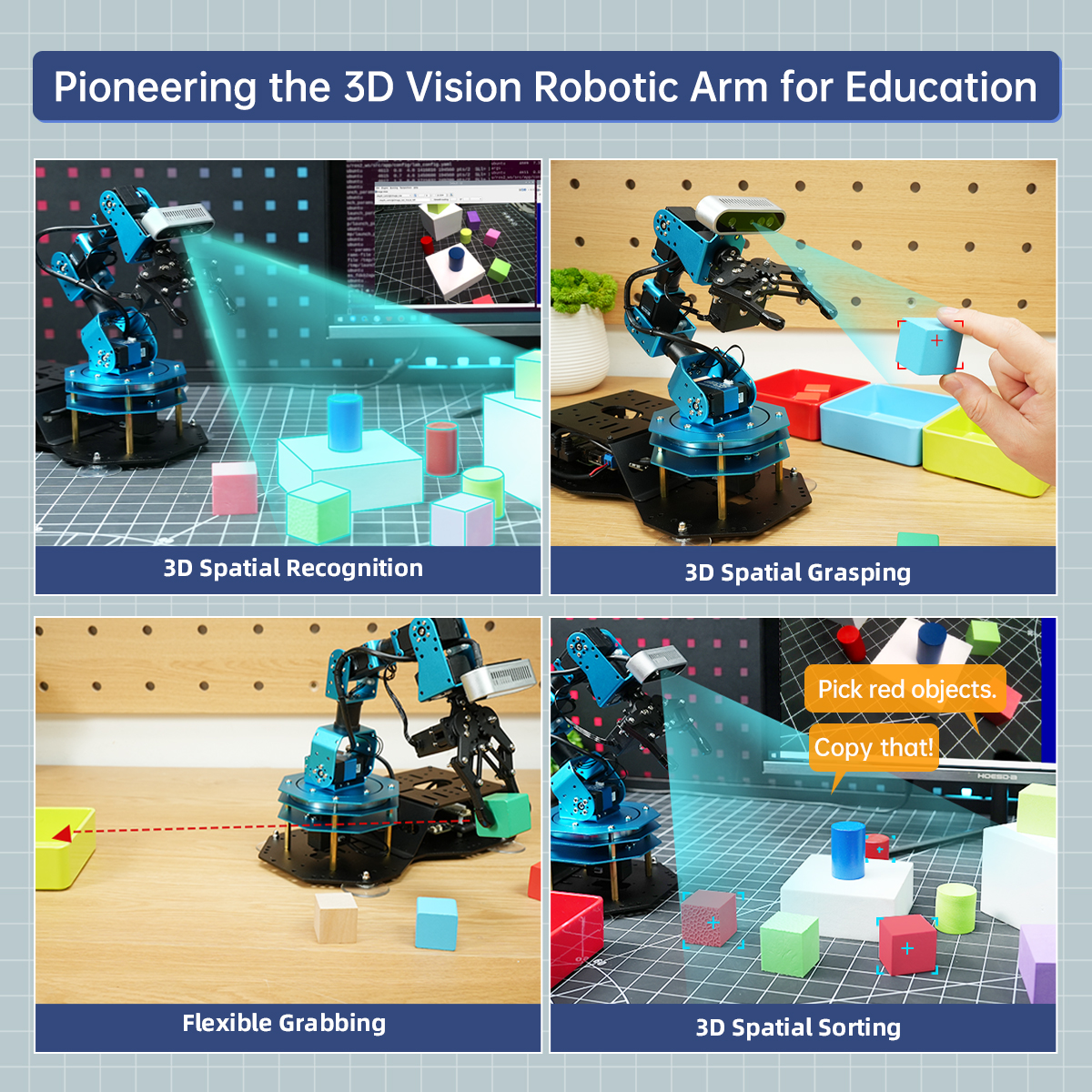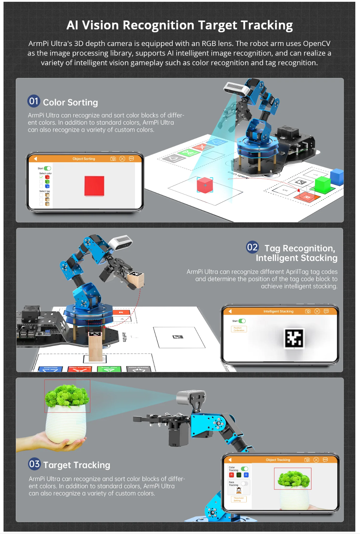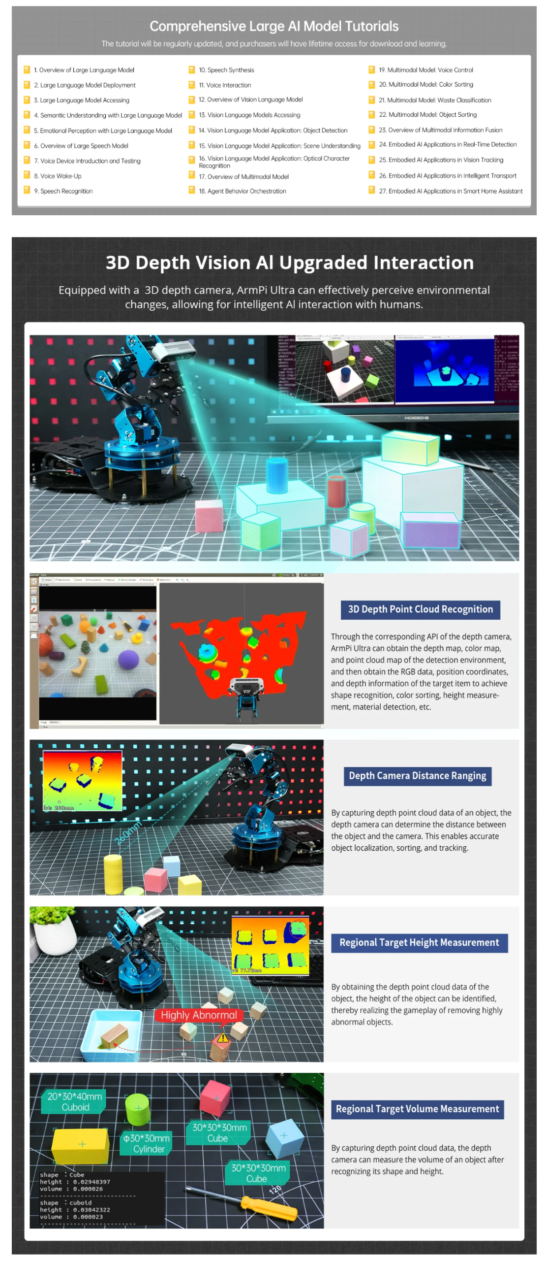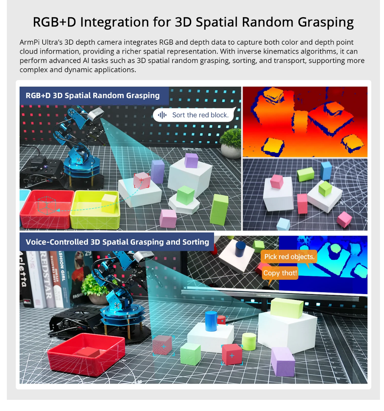 • Depth Point Cloud, 3D Scene, Flexible Grabbing: ArmPi Ultra is equipped with a high-performance 3D depth camera. Based on the RGB data, position coordinates, and depth information of the target, combined with RGB+D fusion detection, it enables free grasping in 3D scenes and other AI applications.