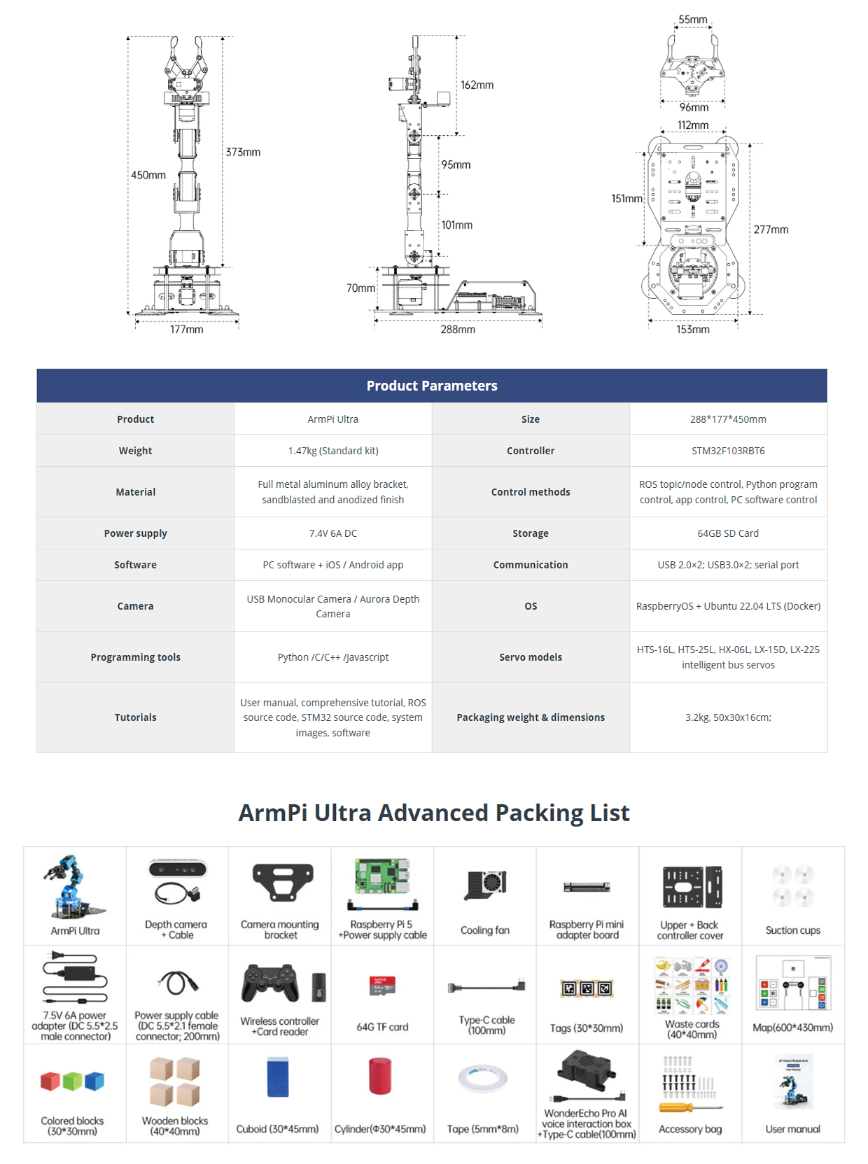 • AI-Driven and Raspberry Pi-Powered: ArmPi Ultra is a high-performance 3D vision robot arm developed for ROS education scenarios. It is equipped with a Raspberry Pi as its central controller and is compatible with ROS 2. With Python and deep learning frameworks integrated, ArmPi Ultra is ideal for developing sophisticated AI projects.