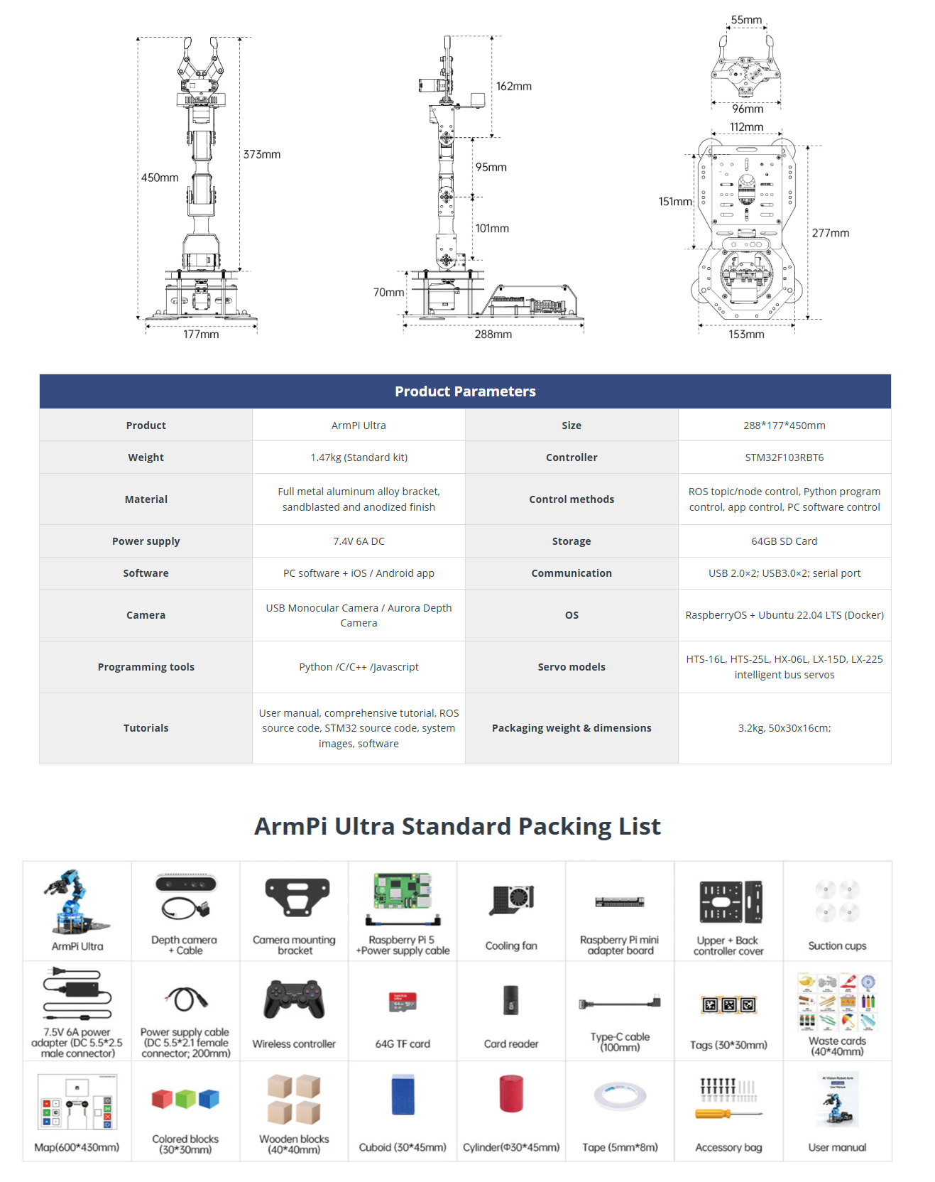 • AI-Driven and Raspberry Pi-Powered: ArmPi Ultra is a high-performance 3D vision robot arm developed for ROS education scenarios. It is equipped with a Raspberry Pi as its central controller and is compatible with ROS 2. With Python and deep learning frameworks integrated, ArmPi Ultra is ideal for developing sophisticated AI projects.