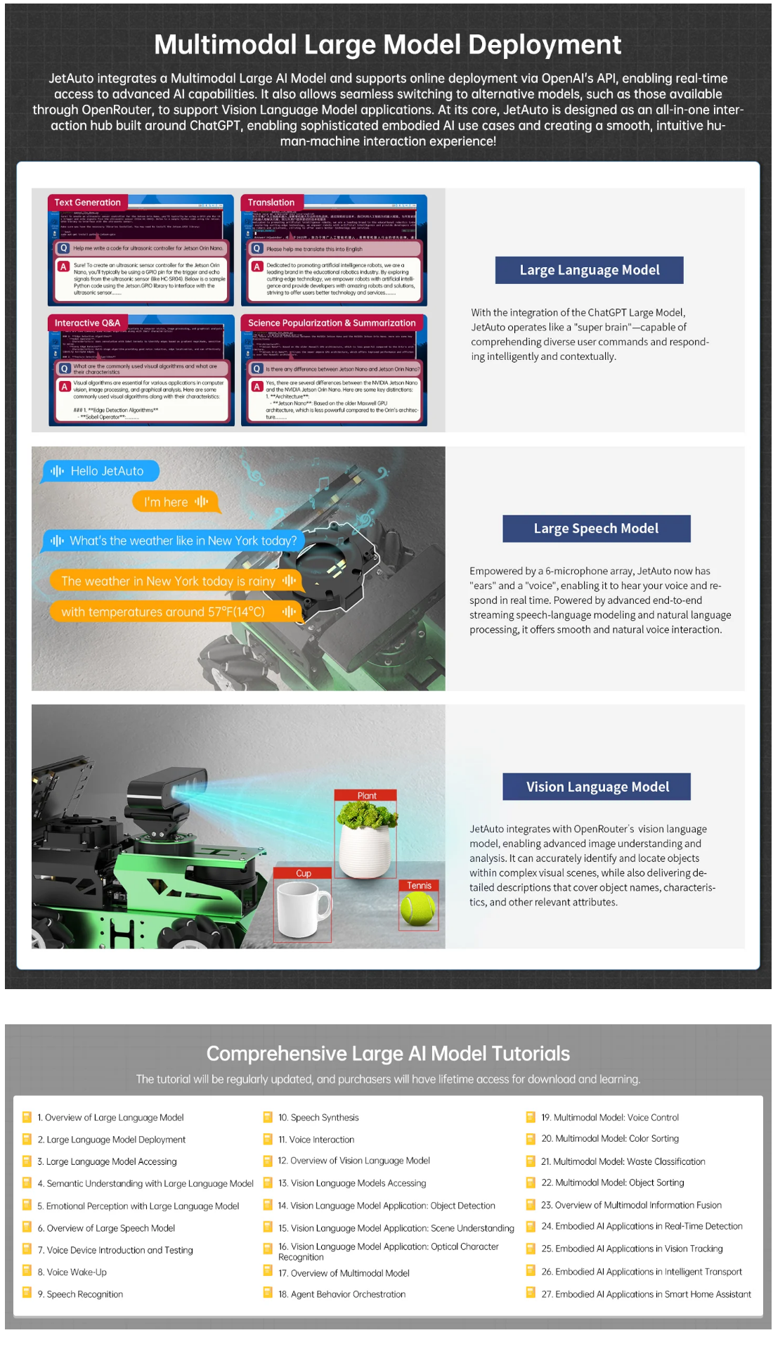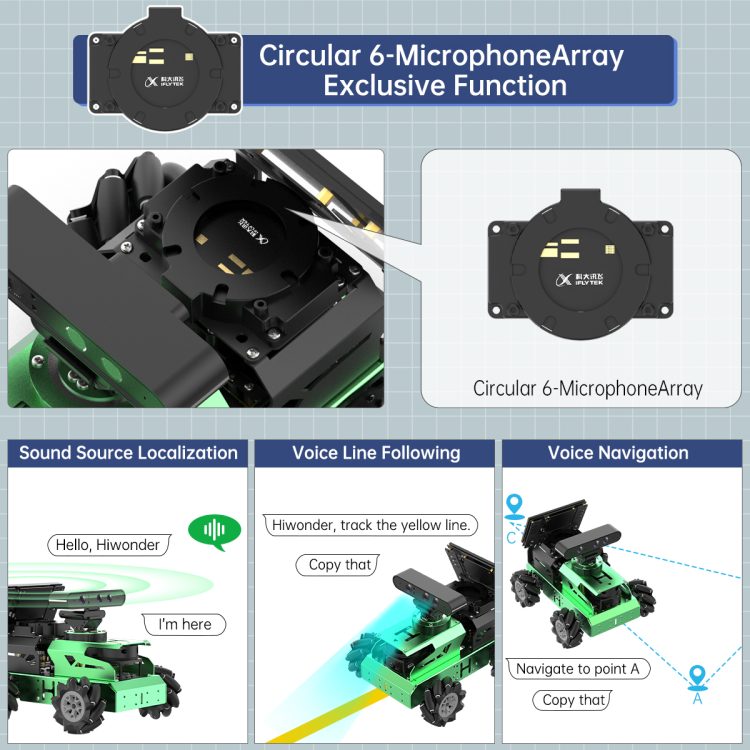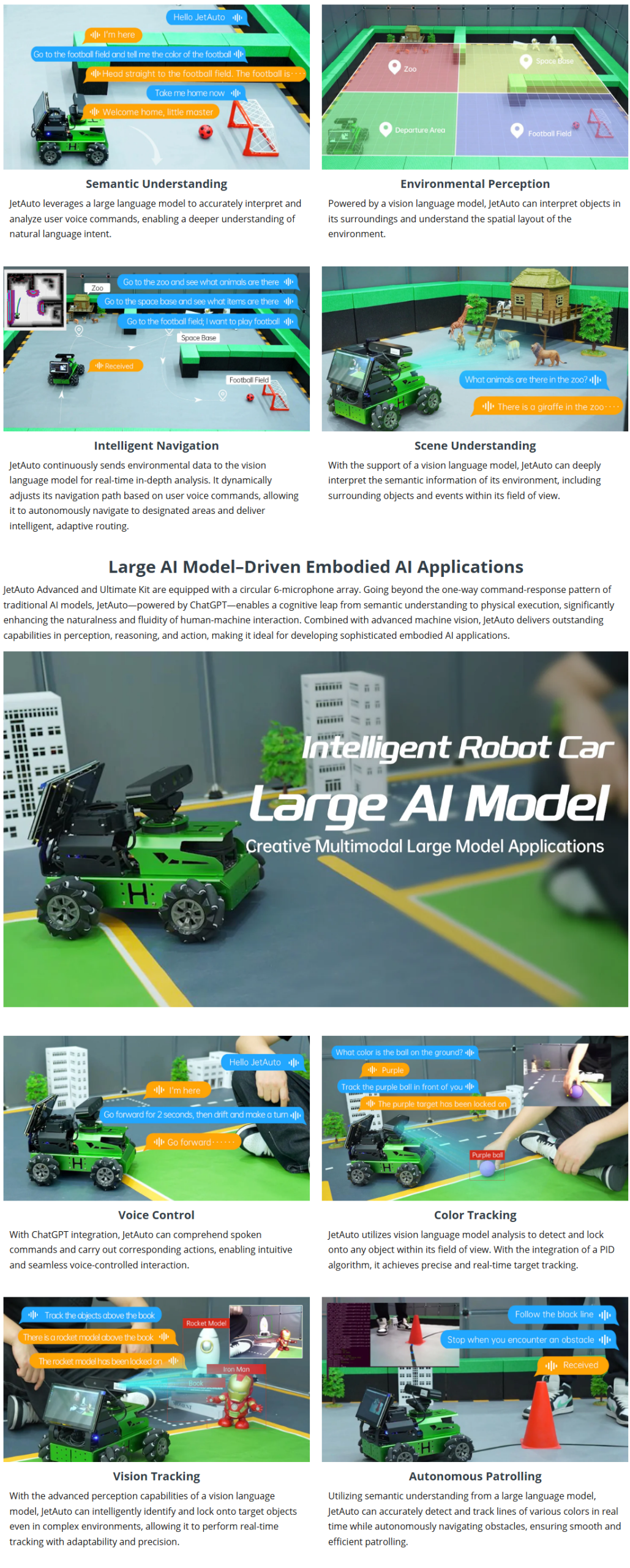 • Empowered by Large Al Model, Human-Robot Interaction Redefined: JetAuto deploys multimodal models with ChatGPT at its core, integrating 3D vision and a 6-microphone array. This synergy enhances its perception, reasoning, and actuation capabilities, enabling advanced embodied AI applications and delivering natural, context-aware human-robot interaction.