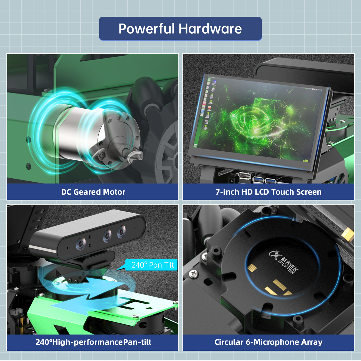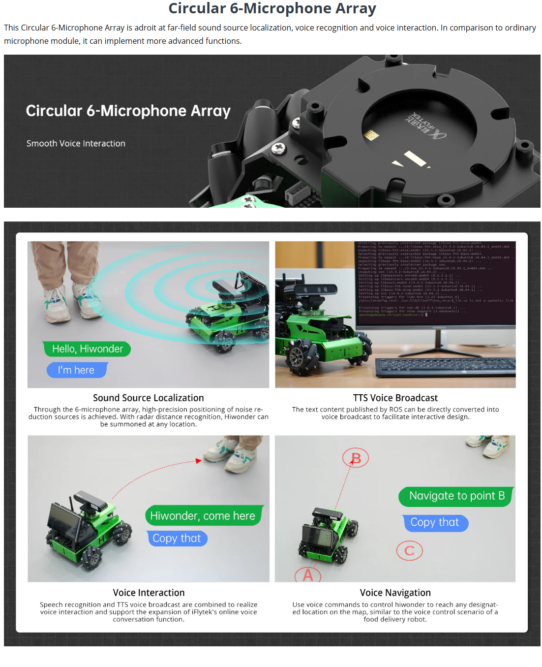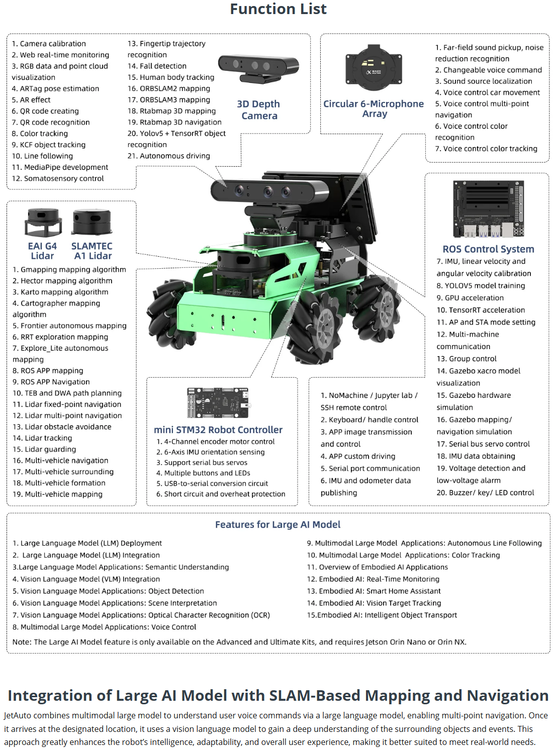 • Empowered by Large Al Model, Human-Robot Interaction Redefined: JetAuto deploys multimodal models with ChatGPT at its core, integrating 3D vision and a 6-microphone array. This synergy enhances its perception, reasoning, and actuation capabilities, enabling advanced embodied AI applications and delivering natural, context-aware human-robot interaction.