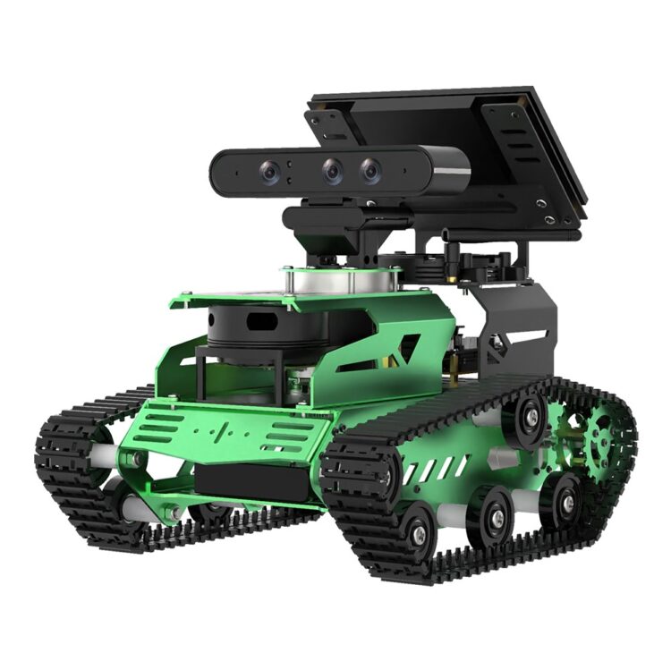 【High-performance Hardware Configurations】JetTank is made of aluminum alloy and employs various hardware components, including reinforced nylon continuous track, 520 Hall encoder gear motors, metal drive wheel, Lidar, Astra Pro Plus depth camera, 6-microphone array, speaker, etc.