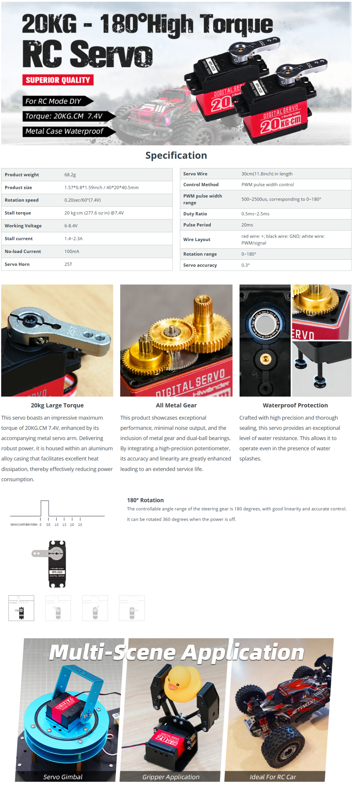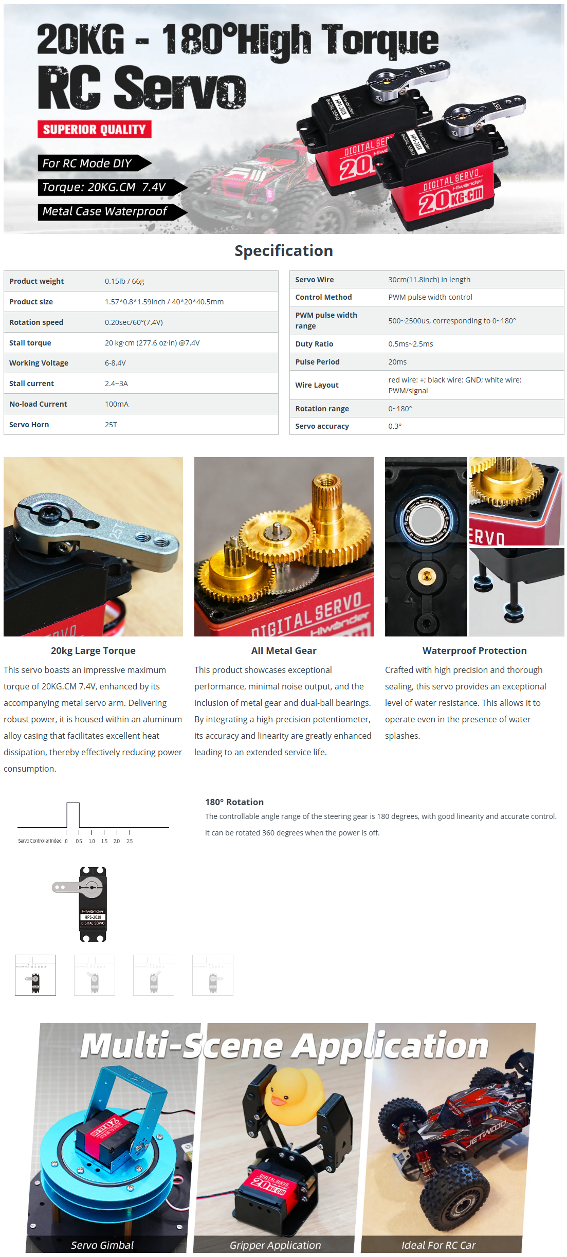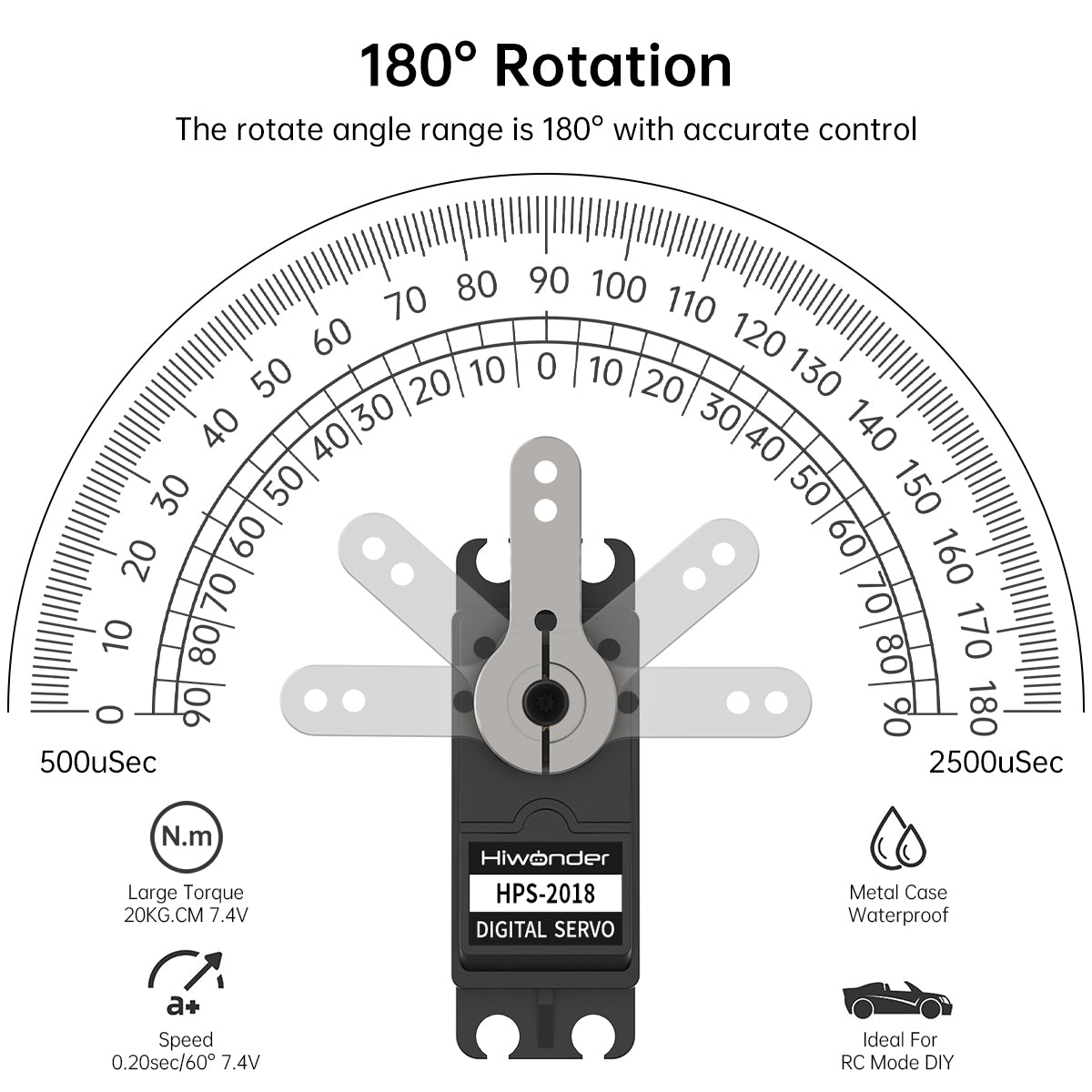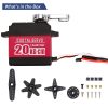 - 20kg-180°High Torque Servo Motor: This RC servo boasts a maximum torque of 20KG—CM 7.4V, enhanced by its accompanying metal servo arm. Delivering robust power, it is housed within an anodized aluminum case that facilitates excellent heat dissipation and effectively reduces power consumption.