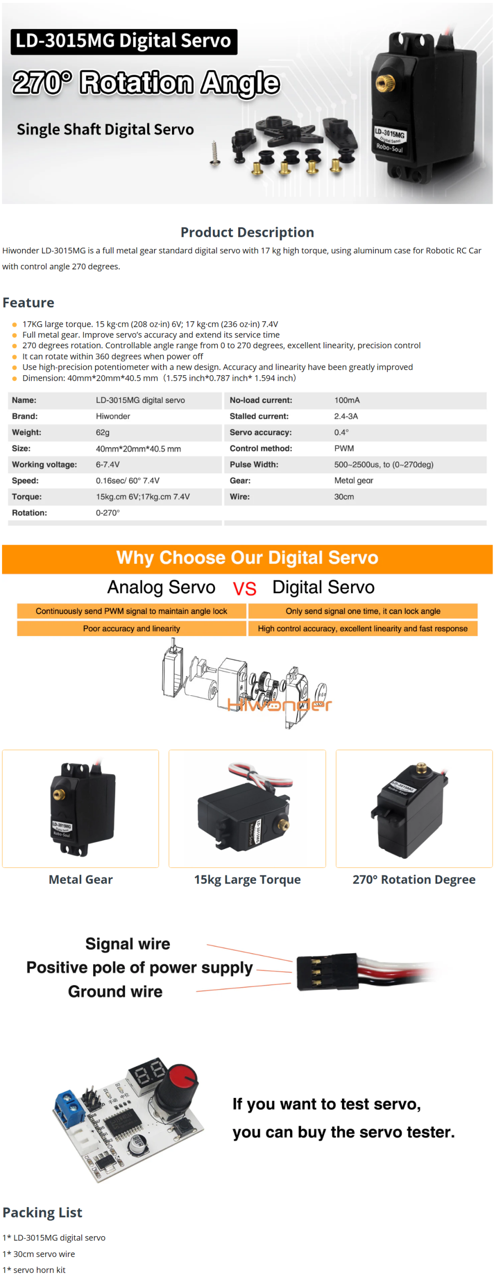 Hiwonder LD-3015MG Full Metal Gear Digital Servo with 17kg High Torque for RC Robot Car