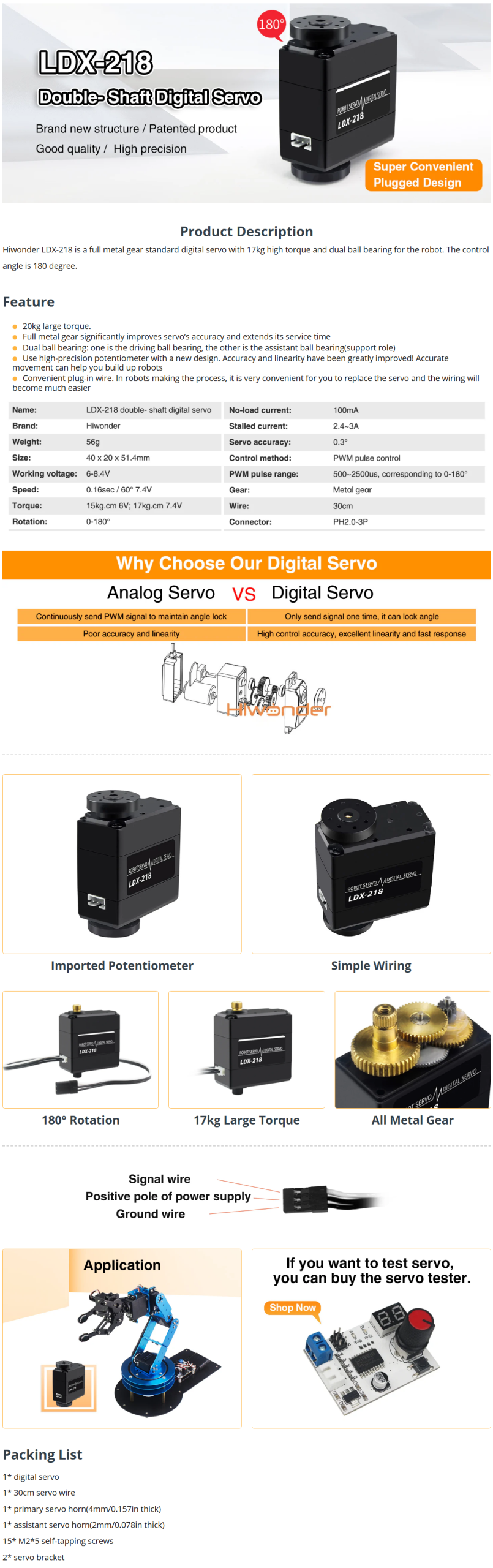 Hiwonder LDX-218 Full Metal Gear Digital Servo with Dual Ball Bearing for Robot (Control Angle 180)