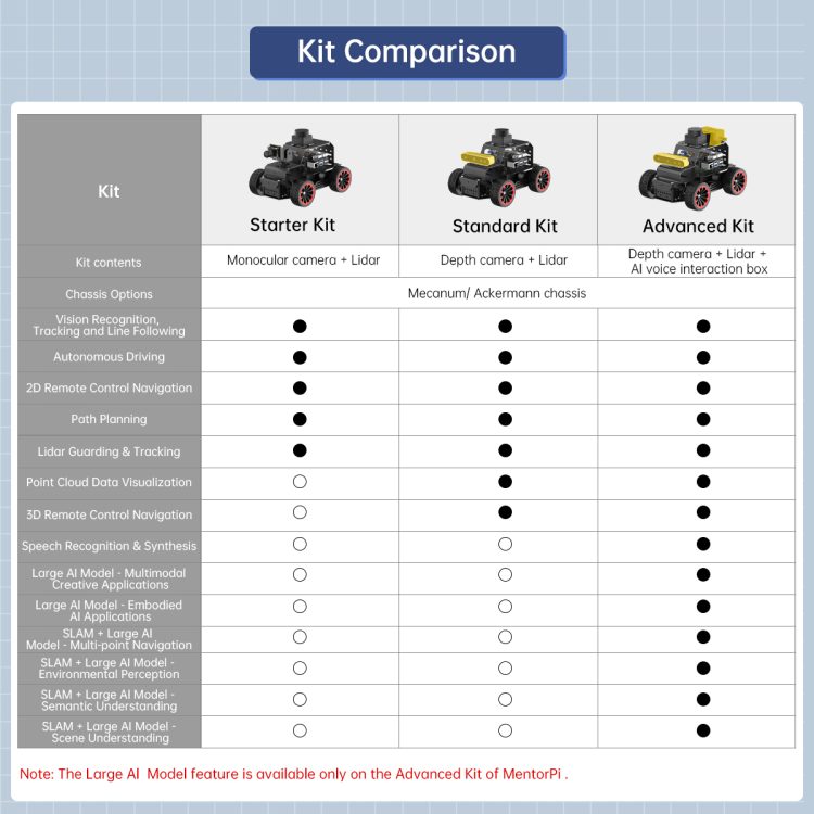 MentorPi is a smart robot car powered by Raspberry Pi 5 and supports ROS2. It offers two chassis options: Mecanum-wheel and Ackerman. It delivers high-performance capabilities and has high-speed closed-loop encoder motors, Lidar, a 3D depth camera, and large-torque servos. These include SLAM mapping, path planning, vision recognition, and autonomous driving. With YOLOv5 model training, MentorPi can detect road signs and traffic lights. Hiwonder also provides detailed ROS2 tutorials and videos to help users get started quickly.MentorPi is an excellent choice for advanced AI robotics.