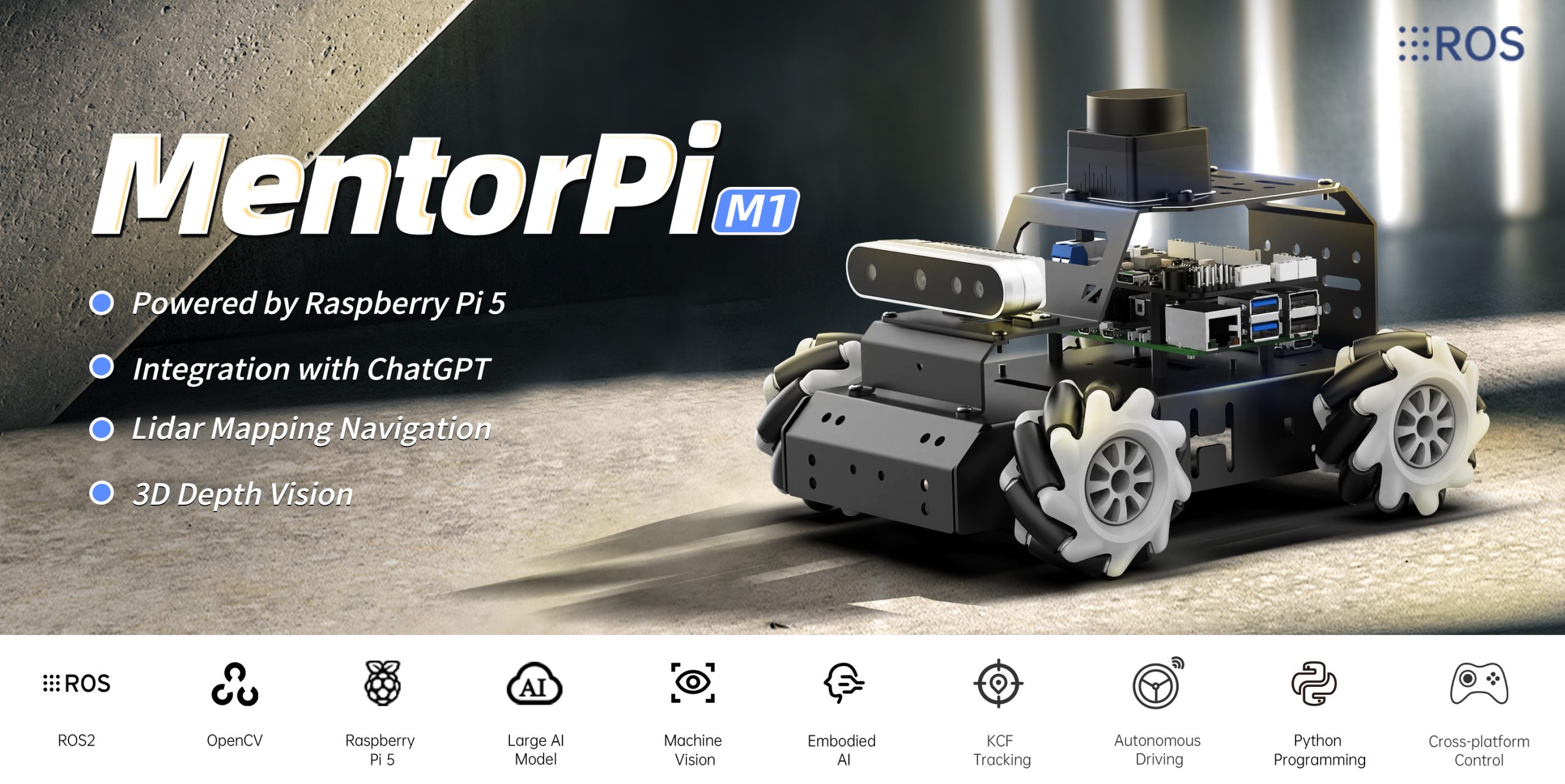 MentorPi is a smart robot car powered by the Raspberry Pi 5 and supports ROS 2. It offers two chassis options: Mecanum-wheel and Ackermann-wheel. Equipped with high-speed closed-loop encoder motors, Lidar, a 3D depth camera, and large-torque servos, it delivers high-performance capabilities. These include SLAM mapping, path planning, vision recognition, and autonomous driving. With the YOLOv5 model training, MentorPi can detect road signs and traffic lights.