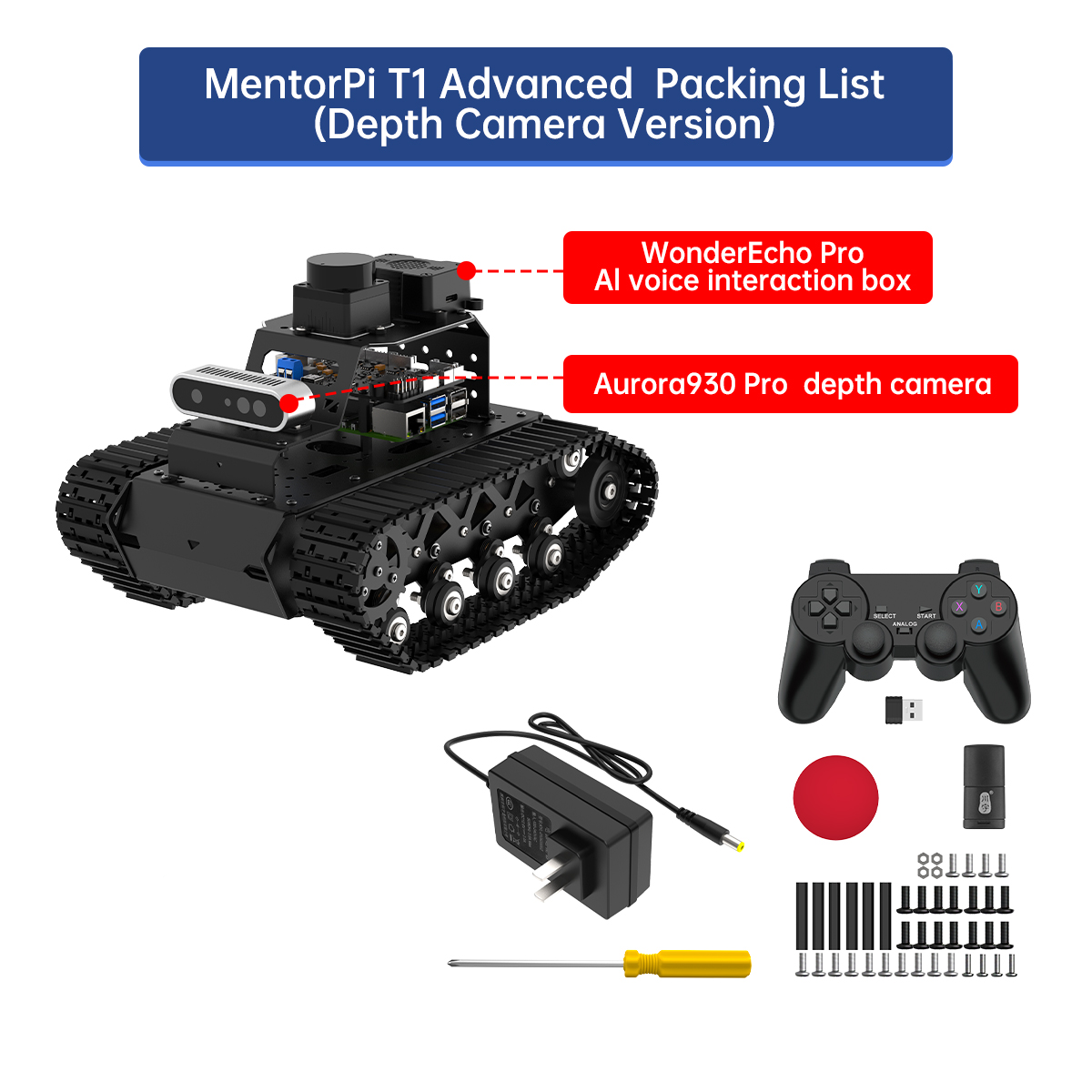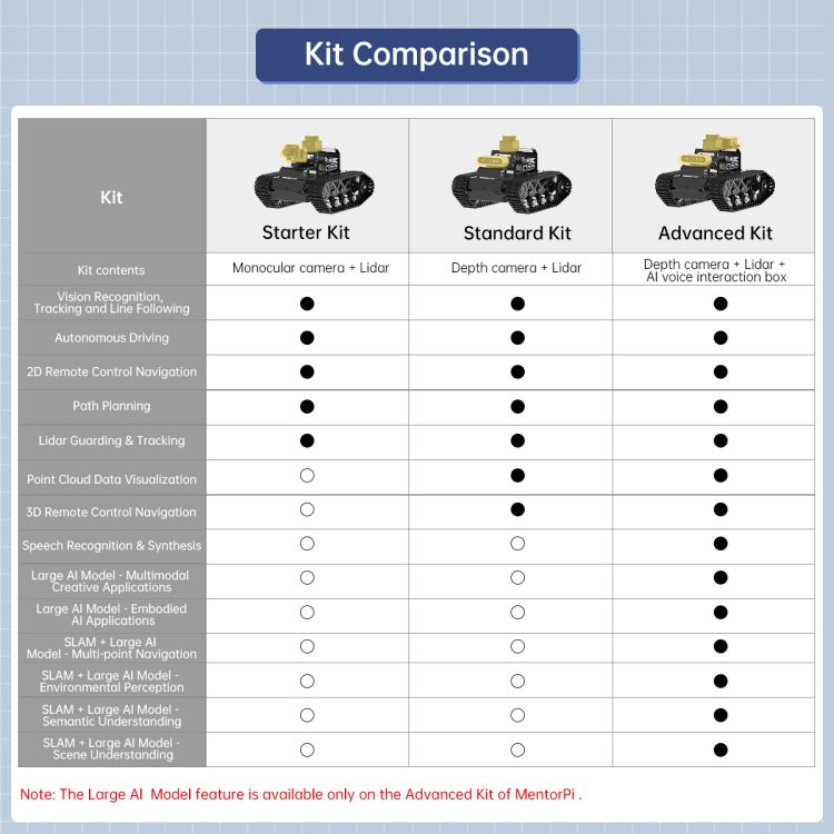 MentorPi is a smart robot car powered by Raspberry Pi 5 and supports ROS2. Equipped with tank chassis, high-speed closed-loop encoder motors, Lidar, a 3D depth camera, and large-torque servos, it delivers high-performance capabilities. These include SLAM mapping, path planning, vision recognition, and autonomous driving. With YOLOv5 model training, MentorPi can detect road signs and traffic lights. MentorPi also deploys a Multimodal Large AI Model to support more advanced embodied AI applications. To help you unlock its full potential, we offer comprehensive tutorials and videos designed to inspire and support your Al creative projects.