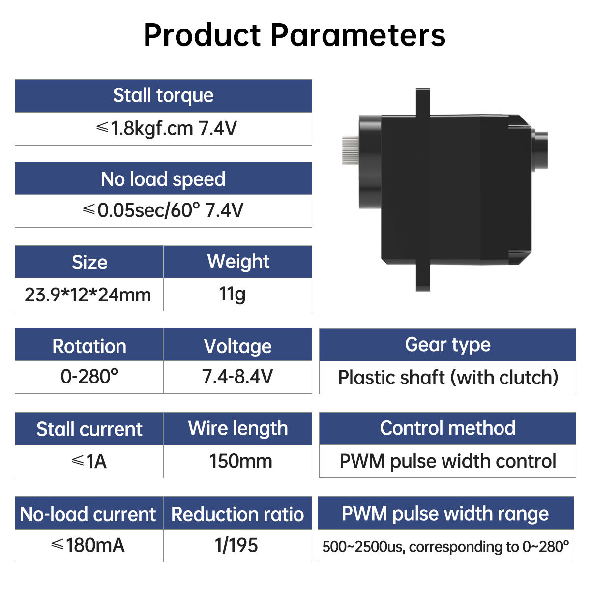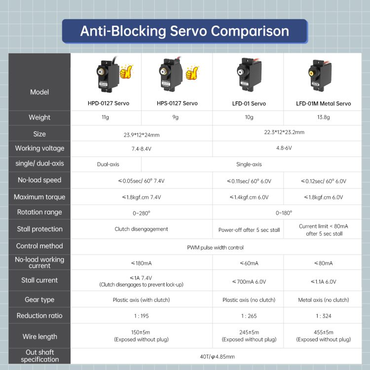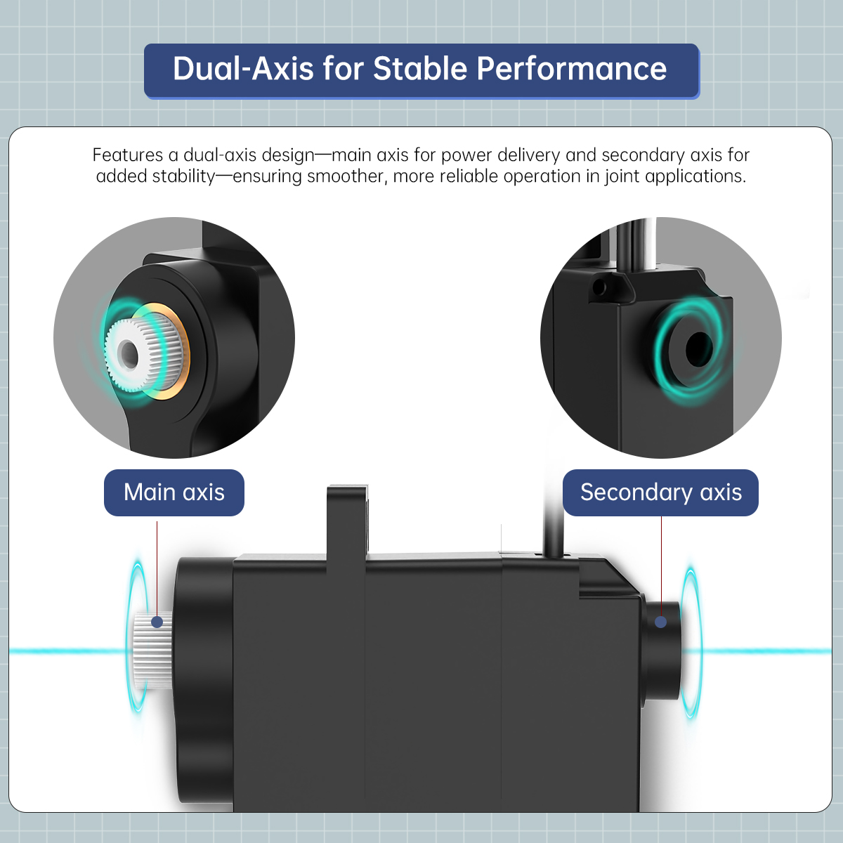 - Smart Clutch with Anti-Stall Protection: Built-in clutch mechanism automatically disengages under stall conditions, preventing damage and extending the lifespan of the servo.