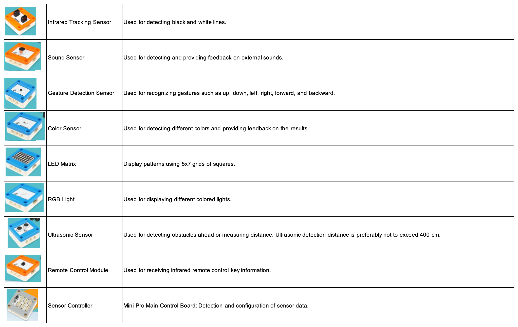 - Sufficient Sensor Options with AI Combination: Sound Sensor, Color Sensor, Gesture Detection Sensor, Infrared Tracking Sensor, Ultrasonic Sensor, RGB Light Sensor.