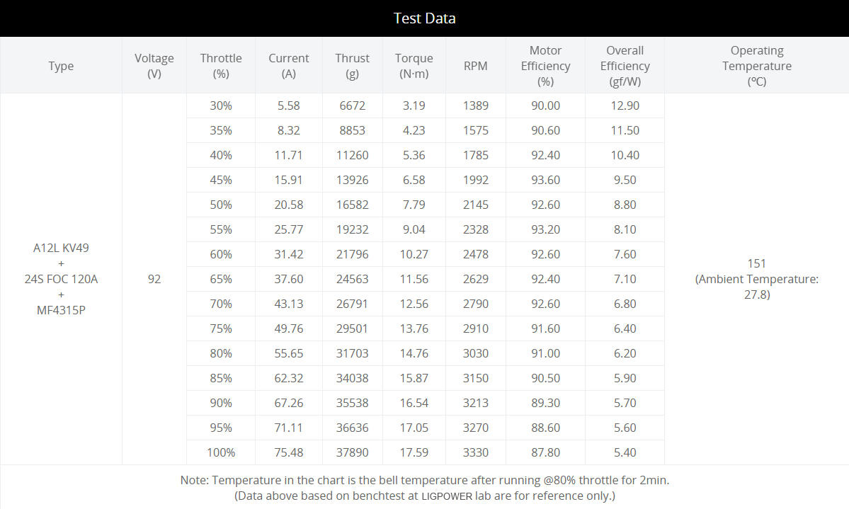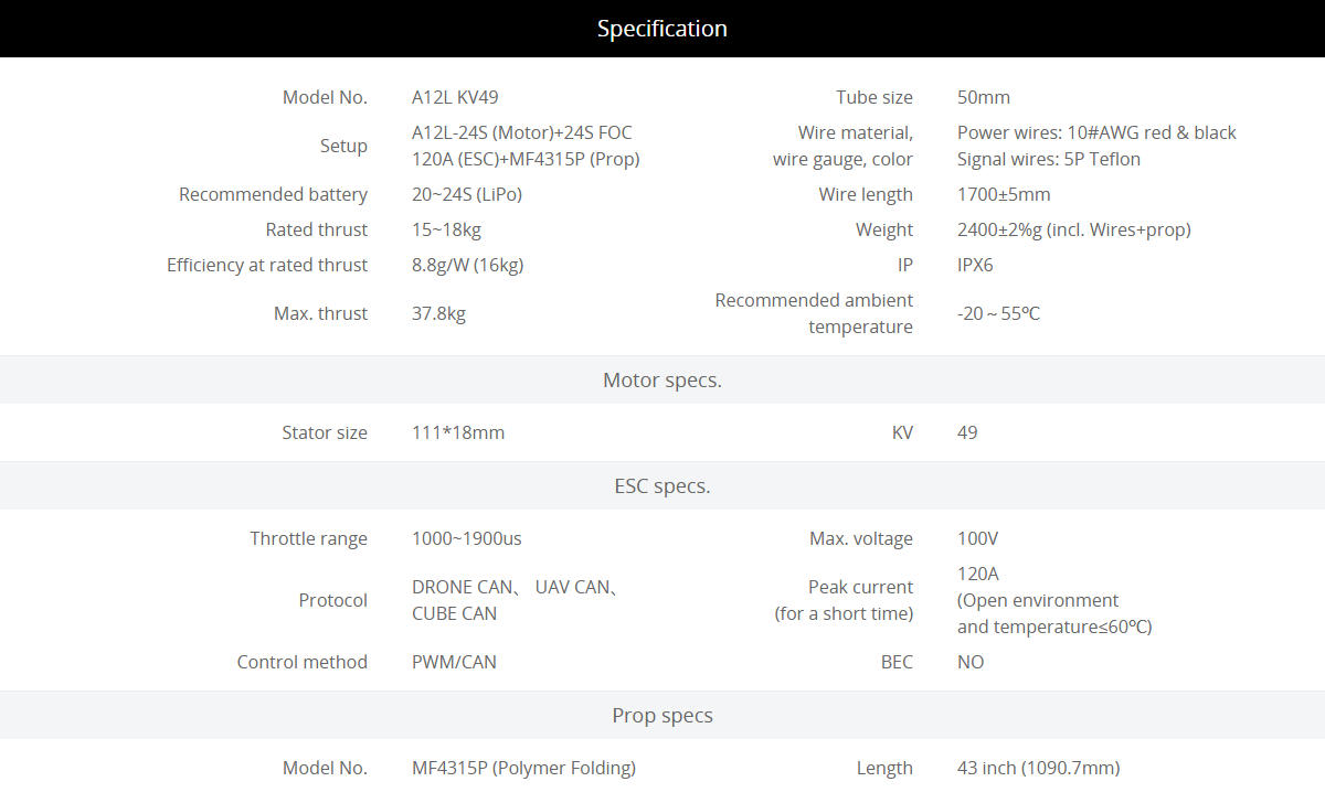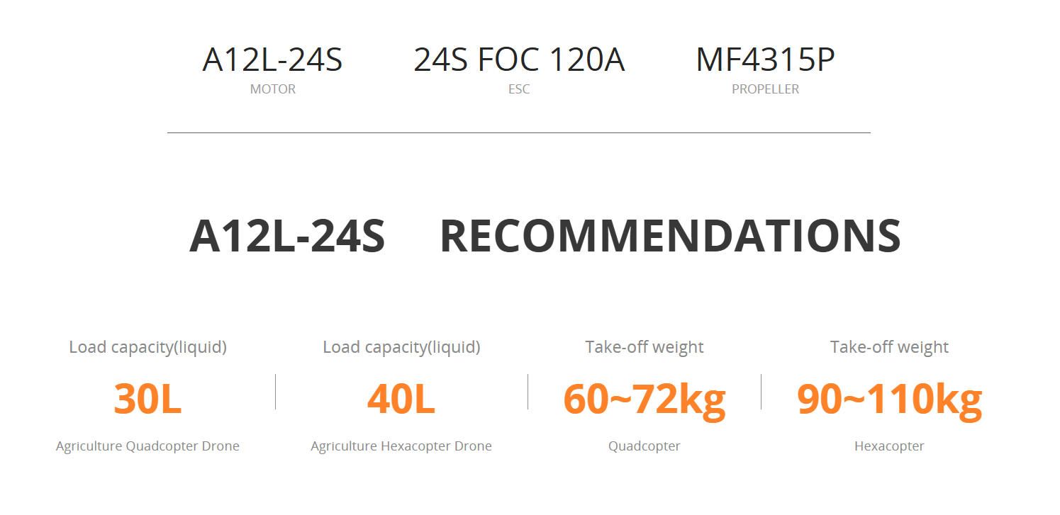The LIGPOWER A12L-24S propulsion system consists of an A12L KV49 brushless motor, a 120A FOC 24S ESC, and an MF4315P folding propeller. It is suitable for 50mm outer diameter drone arms. With a 15-18kg thrust rating, it is ideal for a 30 L Quadcopter and a 40 L hexacopter drone for agricultural spraying. It is suitable for a heavy-load quadcopter with a 60-72kg take-off weight and a hexacopter with a 90-110kg take-off weight.