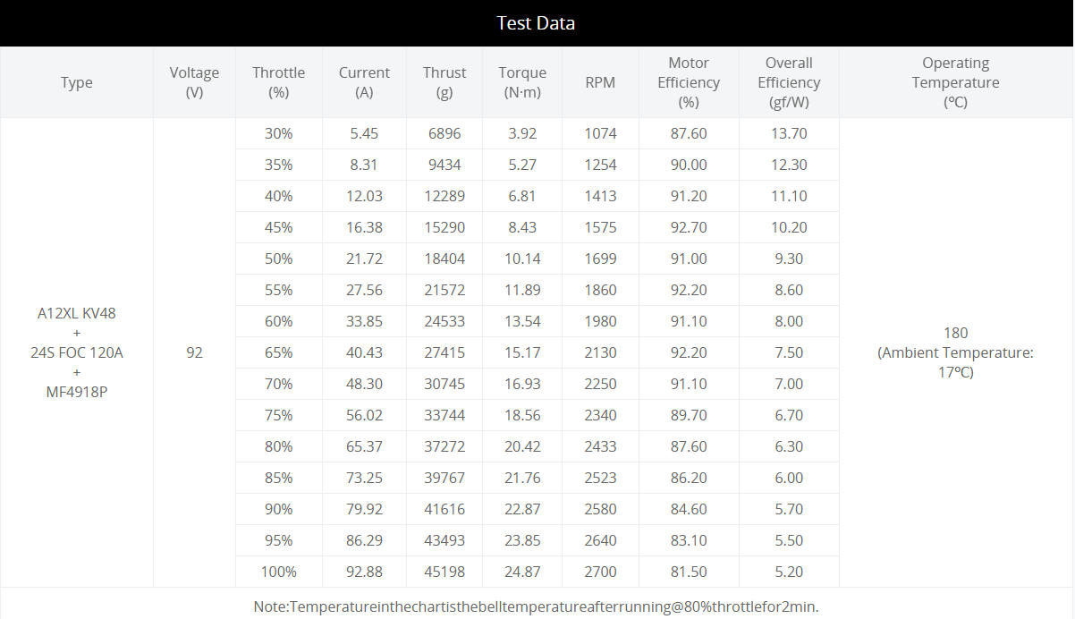 The LIGPOWER A12XL-24S propulsion system consists of an A12XL KV48 brushless motor, a 120A FOC 24S ESC, and an MF4918P folding propeller. It is suitable for 50mm outer diameter drone arms. With a 20-25kg rated thrust, it is ideal for a 40L Quadcopter and a 50L hexacopter drone for agricultural spraying. It is suitable for a heavy-load quadcopter with an 80-88kg take-off weight and a hexacopter with a 120-132kg take-off weight.