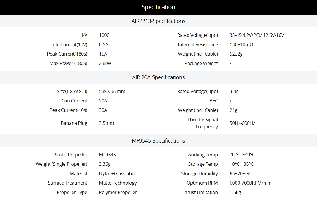 - Plug-and-Play Kit – Includes AIR 2213 KV1000 motor, AIR 20A ESC, and 3- 4S voltage compatibility.