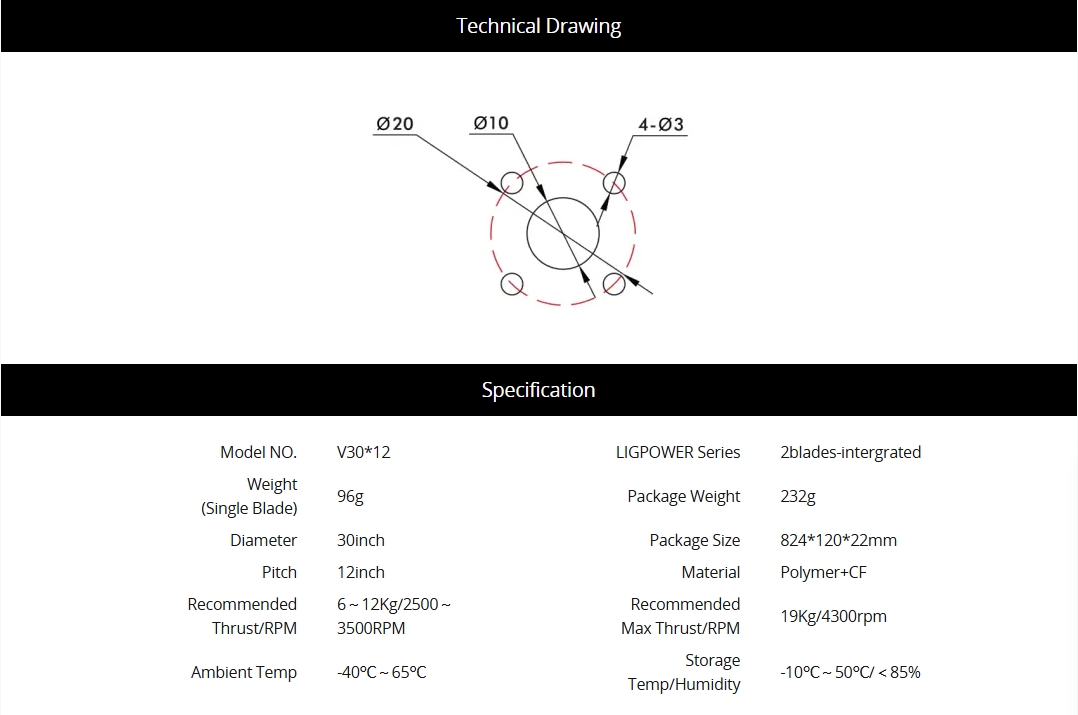LIGPOWER V30x12-Prop-2PCS/PAIR Advanced Polymer and Carbon Fiber VTOL Propeller