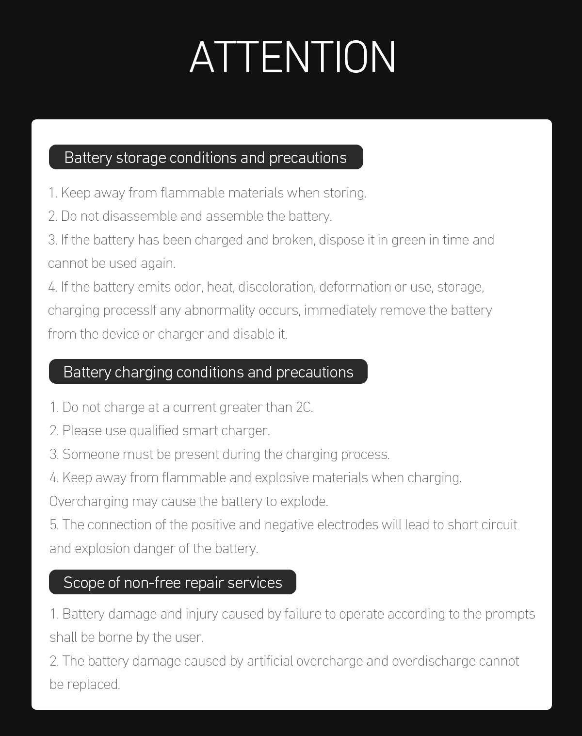 - It is strictly prohibited to immerse the battery in water. When stored or unused, it should be placed in a cool and dry environment