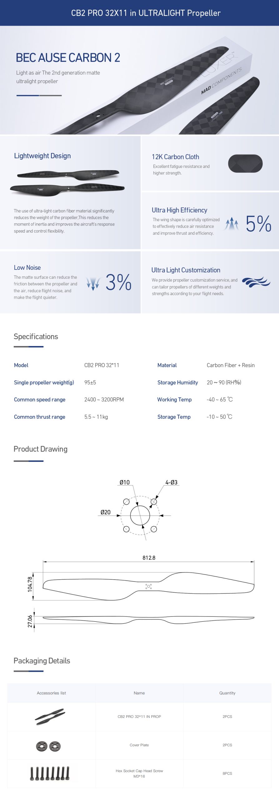MAD Components Ultralight Carbon Fiber Propeller for UAV Drone 1 Pair CW+CCW CB2 PRO 32×11 inch D10-D20(M3*4)