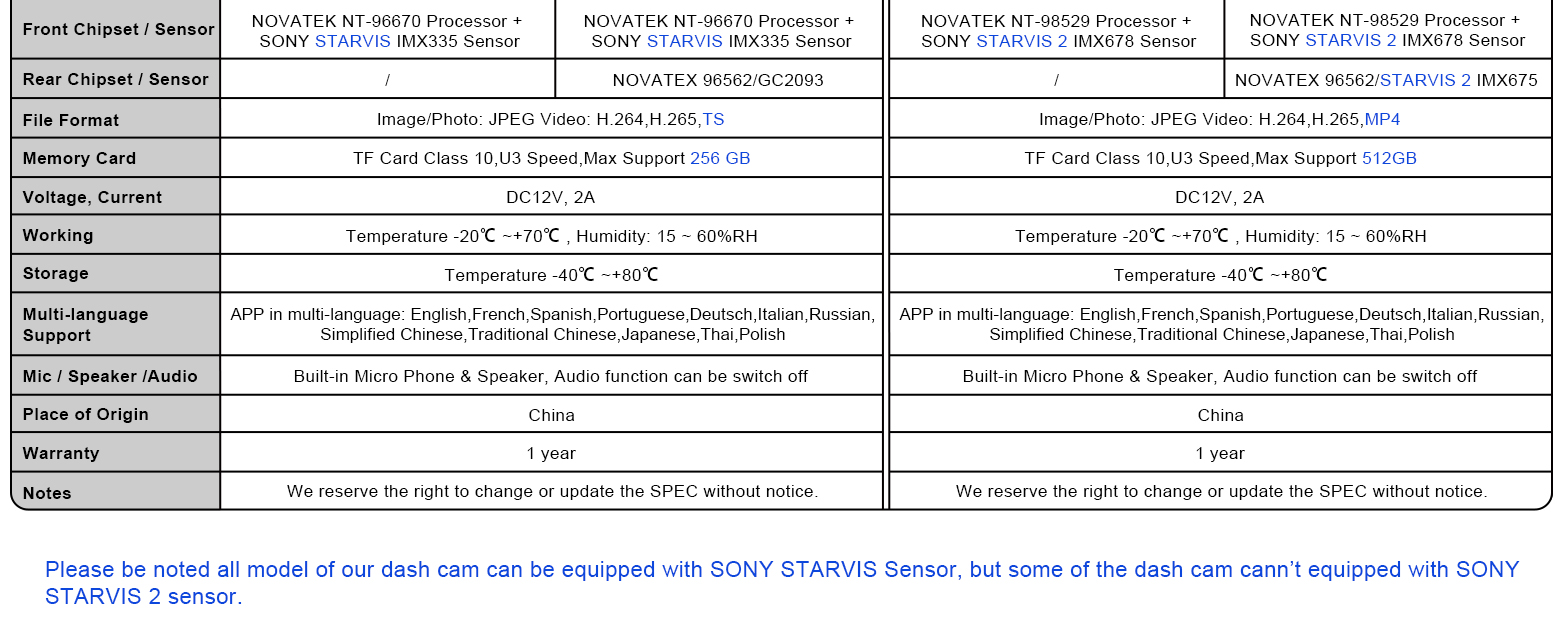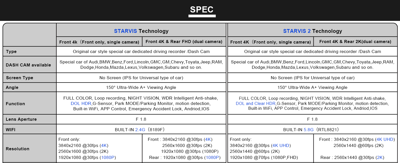 | Variant | 128GB Industrial Grade microSD Card, U3 A2 V30, 256GB Industrial Grade microSD Card, U3 A2 V30, 512GB Industrial Grade microSD Card, U3 A2 V30, 64GB Industrial Grade microSD Card, U3 A2 V30, Front 4K & Rear 2K (STARVIS 2 technology), Front 4K & Rear FHD (STARVIS technology), Front 4K Only (STARVIS 2 technology), Front 4K Only (STARVIS technology), Fuse Box Power Adapter – 16.40ft (5m), Fuse Box Power Adapter – 8.20ft (2.5m), GPS, OBD cable, Rear 2K (STARVIS 2 technology), Rear camera extension cable – 18.04ft (5.5m), Rear camera extension cable – 21.32ft (6.5m) |