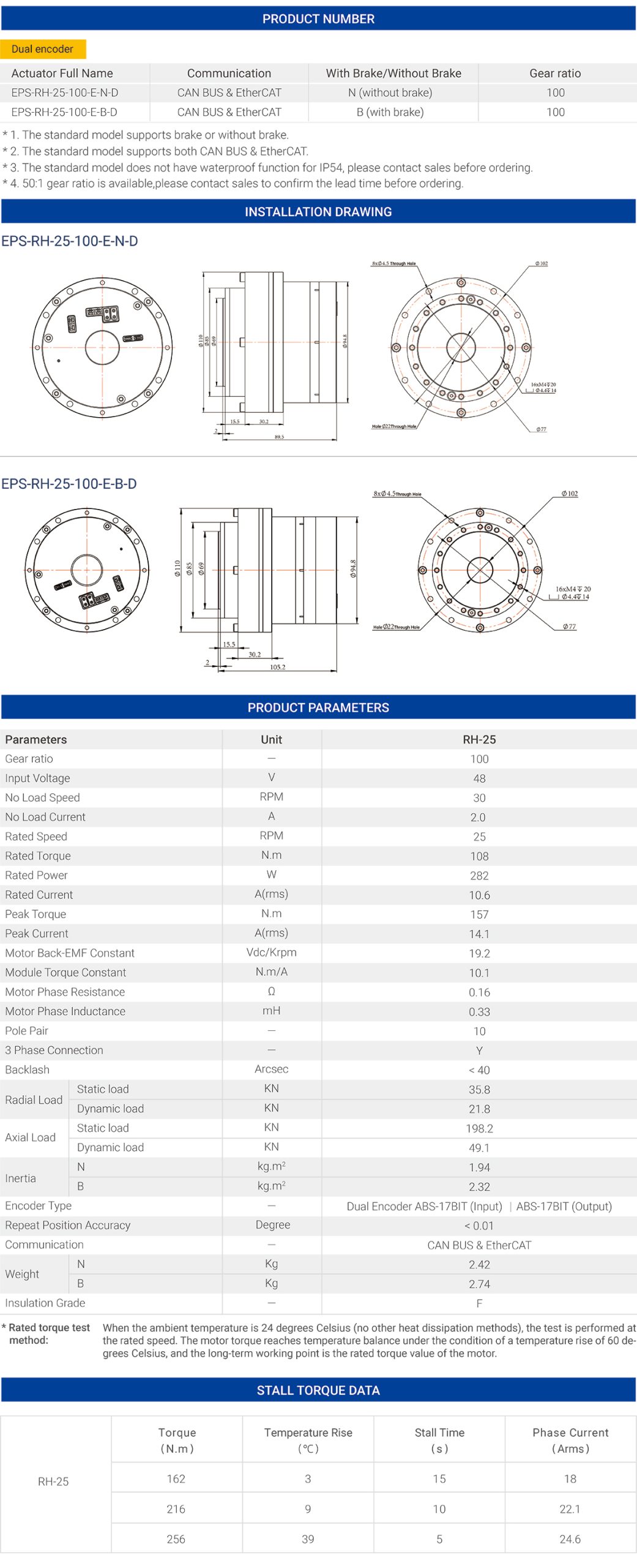 RH-25EtherCAT+CAN BUS Harmonic joint motor Robot joint motor Large hollow design High precision high torque harmonic reducer. Extremely fast response dual-protocol intelligent communication system. Equipped with EtherCAT gigabit bus + CAN dual communication protocol, the command transmission rate reaches 100Mbps, and the synchronization cycle is shortened to 250μs, allowing the multi-axis linkage accuracy to break through the millisecond limit