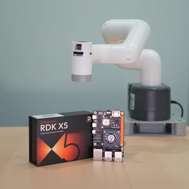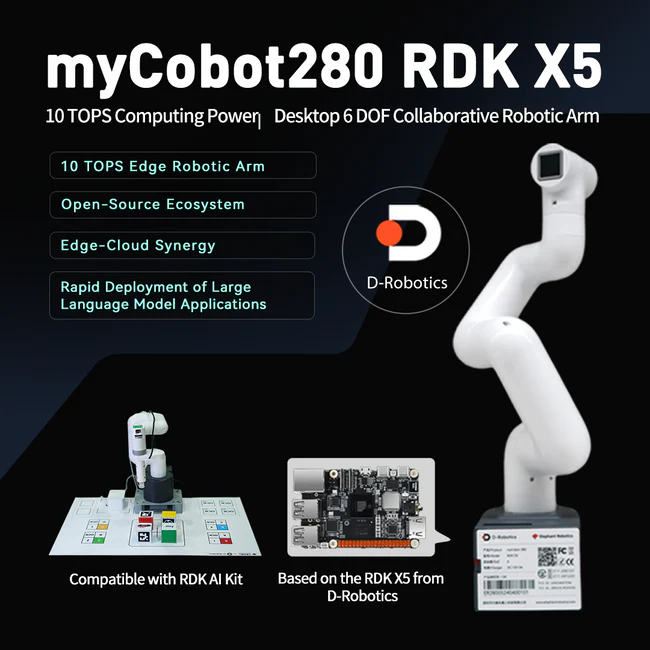 The myCobot 280 RDK X5 is built with the RDK OS operating system and equipped with the D-Robotics RDK X5 Robot Developer Kit. It offers up to 10 TOPS of computing power and supports various complex models, including Transformer, RWKV, Occupancy, Stereo Perception, and the latest algorithms. This enables rapid deployment of intelligent applications. With a focus on intelligent computing and robotics applications, it provides rich interfaces and exceptional ease of use.