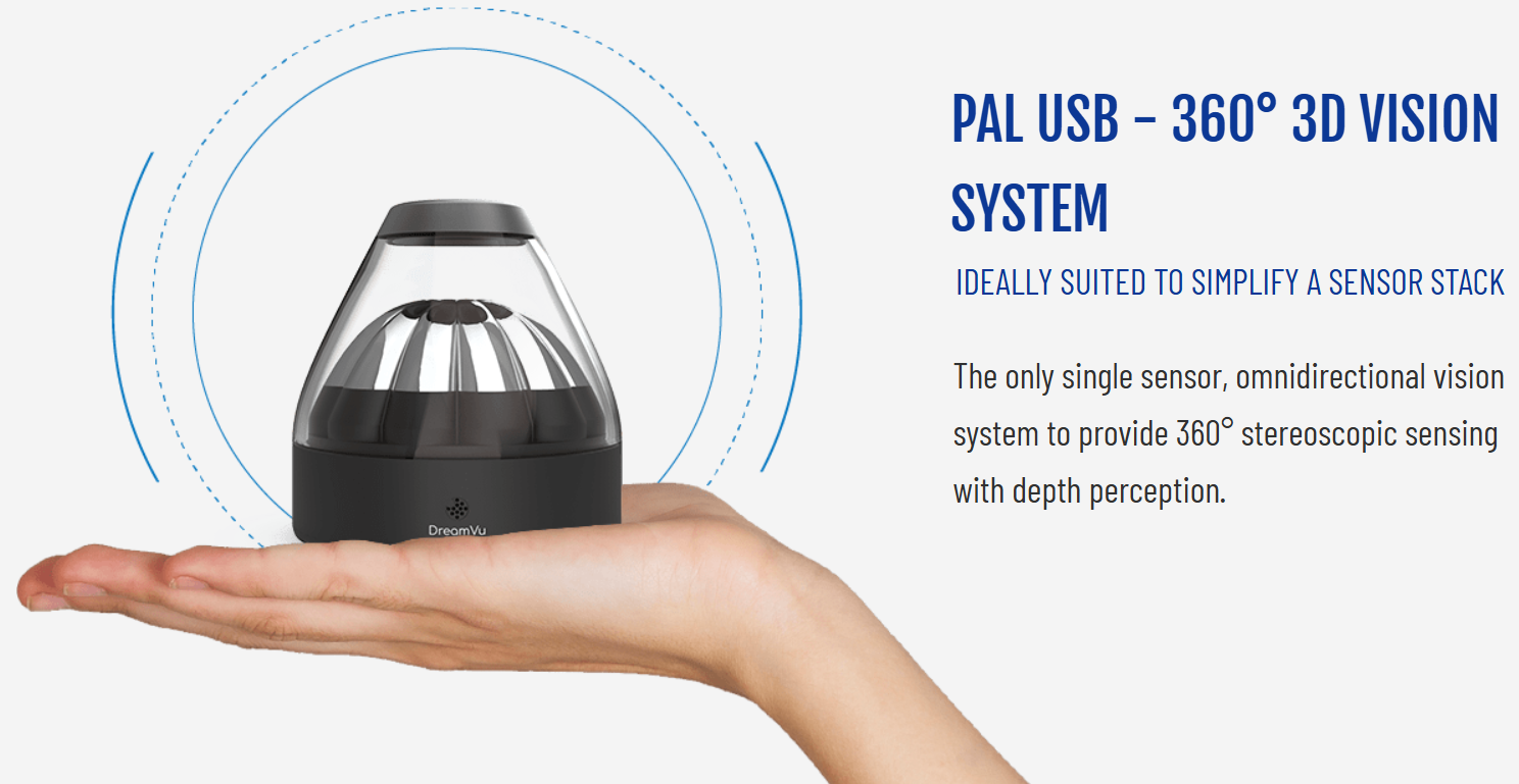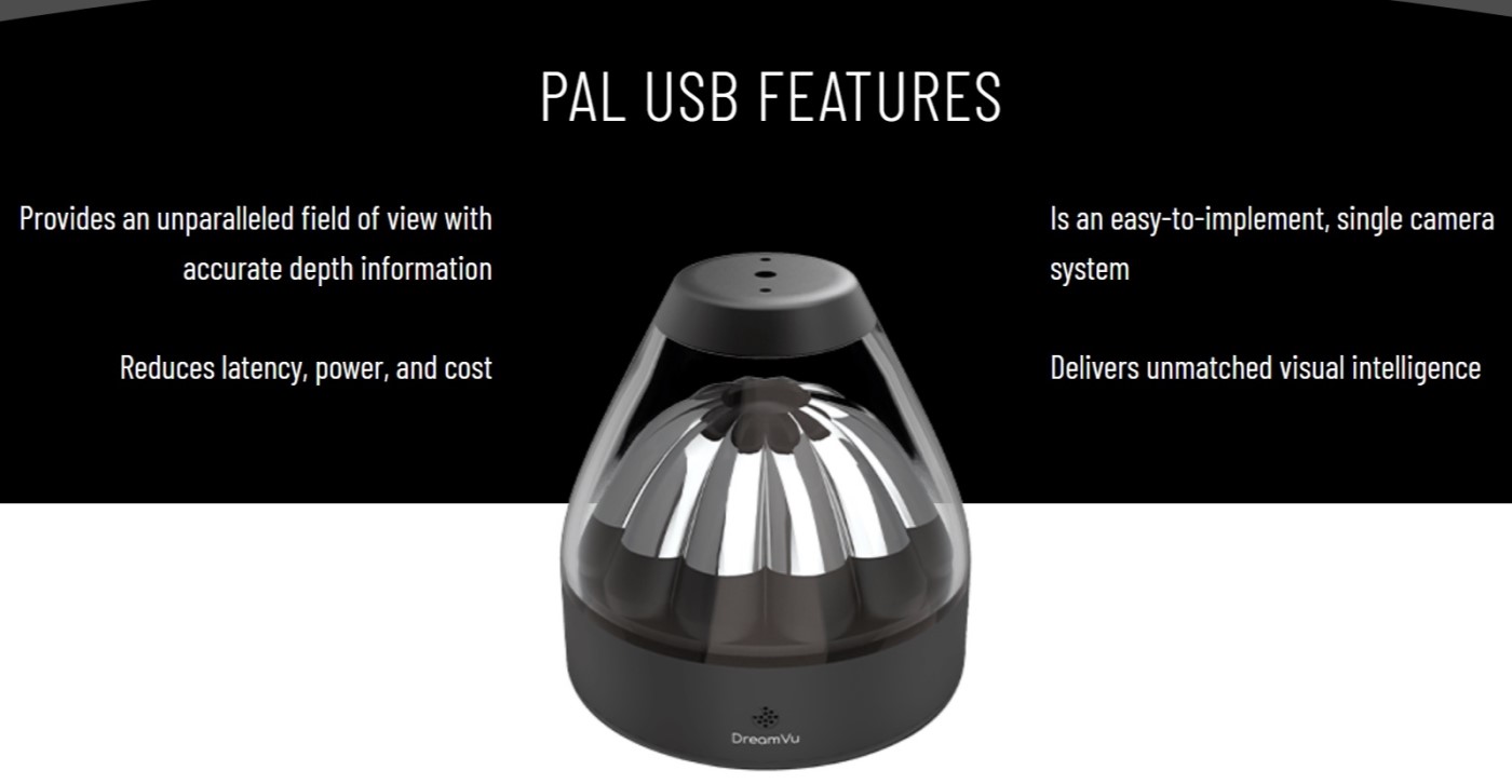 PAL USB is a single-sensor, omnidirectional vision system that provides 360° stereoscopic sensing with depth perception. At 2.5W, it is the lowest-power and lowest-cost option available. It is designed for video processing to be performed on a host computer.