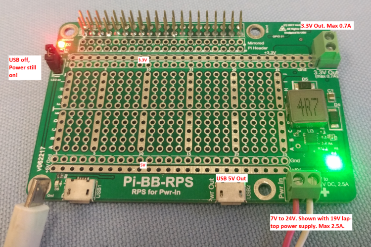 • Provides 5V USB power out (max 2.5A). USB power out is the RPS power and can be used to power other devices. In addition, 3.3V/700mA power out is available via a terminal block to power 3.3 V devices. 3.3V is independently generated on the Pi-BB-RPS board, offloading the 3.3V power supply on the Raspberry Pi.