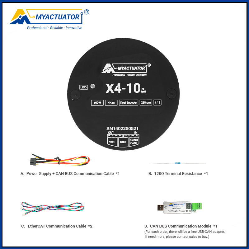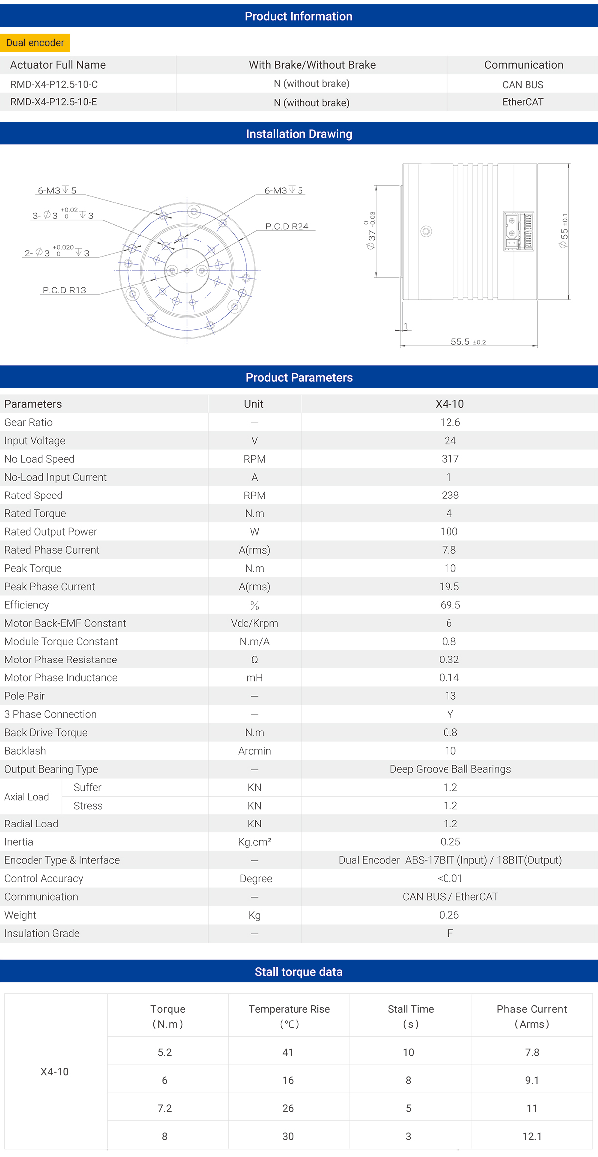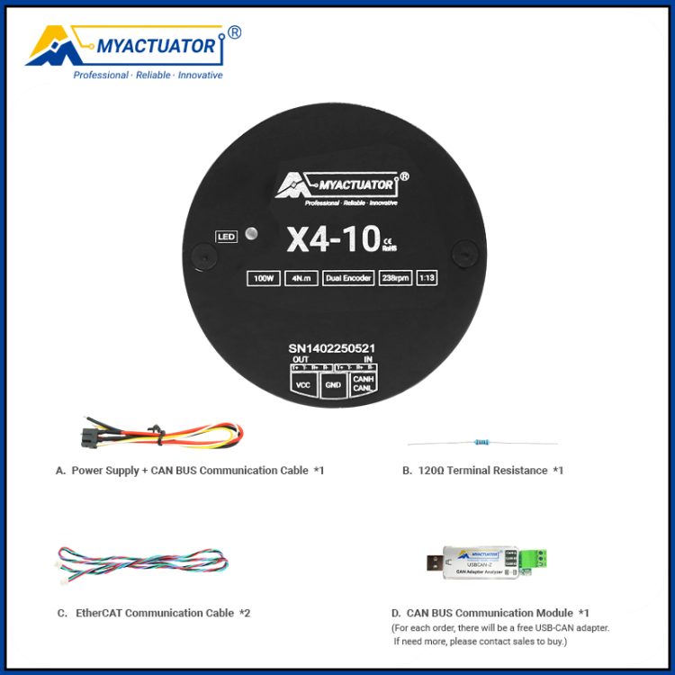 MyActuator  RMD-X4-P12-10-E The large hollow structure is compatible with multi-sensor integration, providing a data center for the robot’s full-body posture control. EtherCAT’s high-speed communication supports multi-machine linkage, meeting the needs for efficient collaboration in flexible production lines.
