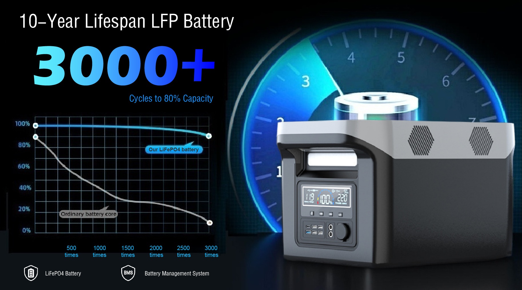 • Long Lifespan: The Power Station ML1500S Lite uses EV-grade LiFePO4 batteries with a cycle life of up to 3000+. The internal BMS system monitors battery voltage, current, and temperature in real time, providing diverse safety protections such as Short-circuit, Under-voltage, Over-load, Over-heat, Over-voltage, and Over-current.
