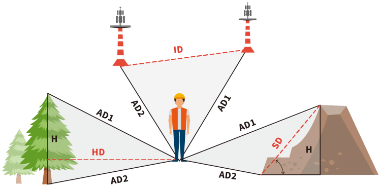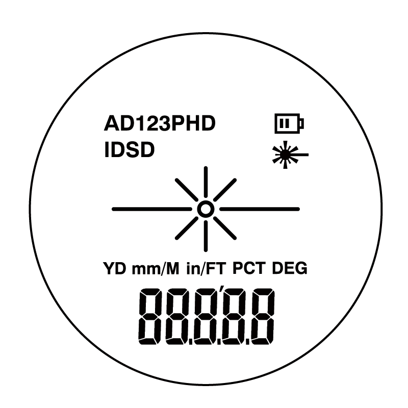 - Multiple measuring modes, including Actual Distance (AD), 2 Point Height (2PH), 3 Point Height (3PH), Interval Distance (ID),
