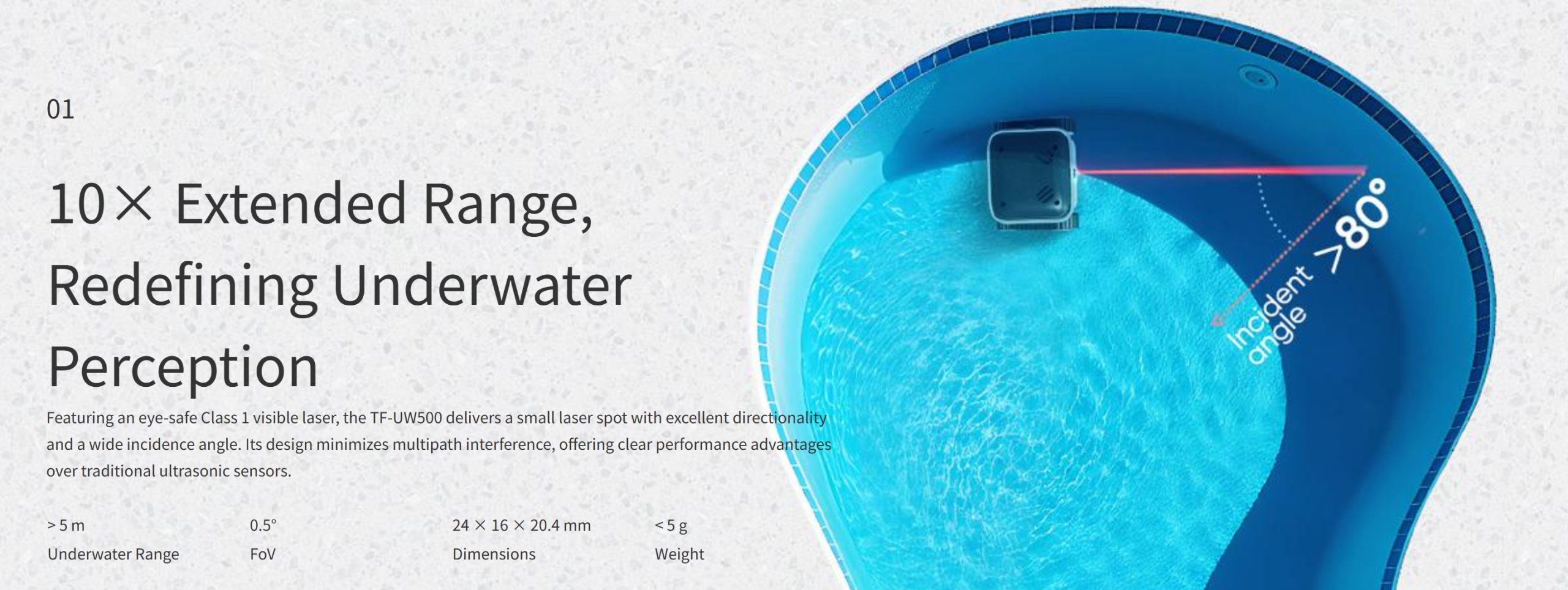 Featuring an eye-safe Class 1 visible laser, the TF-UW500 delivers a small laser spot with excellent directionality and a wide incidence angle. Its design minimizes multipath interference, offering clear performance advantages over traditional ultrasonic sensors.