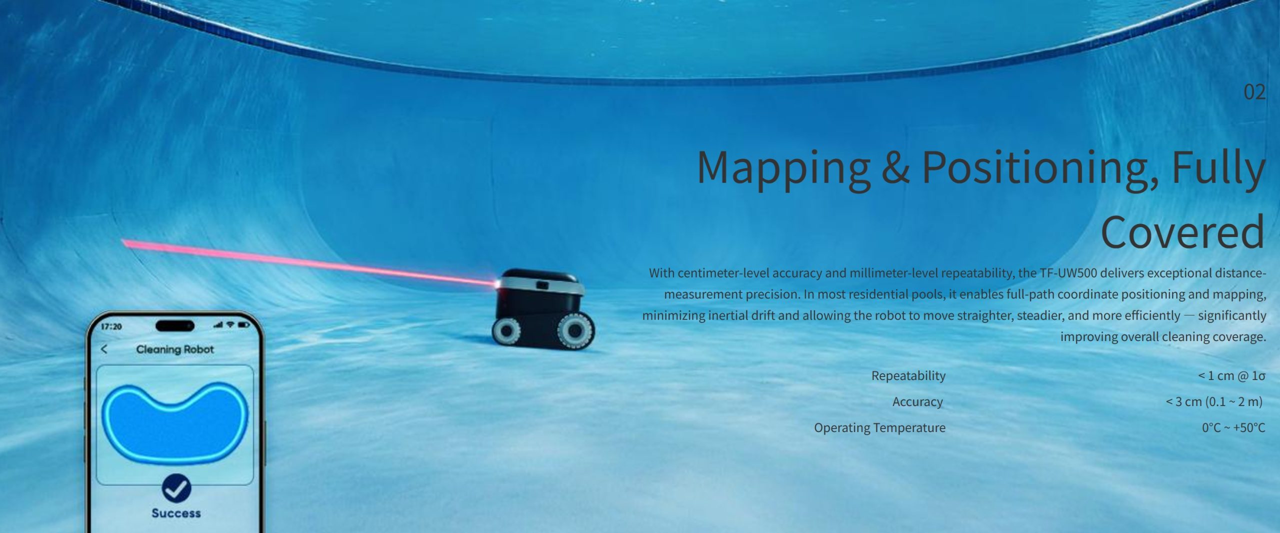 Adopting a dToF (direct Time-of-Flight) solution, the TF-UW500 maintains the compact design and low power efficiency of its predecessor while achieving a tenfold increase in detection range in low-turbidity water — enabling underwater robots to achieve breakthroughs in both precise mapping and stable positioning.