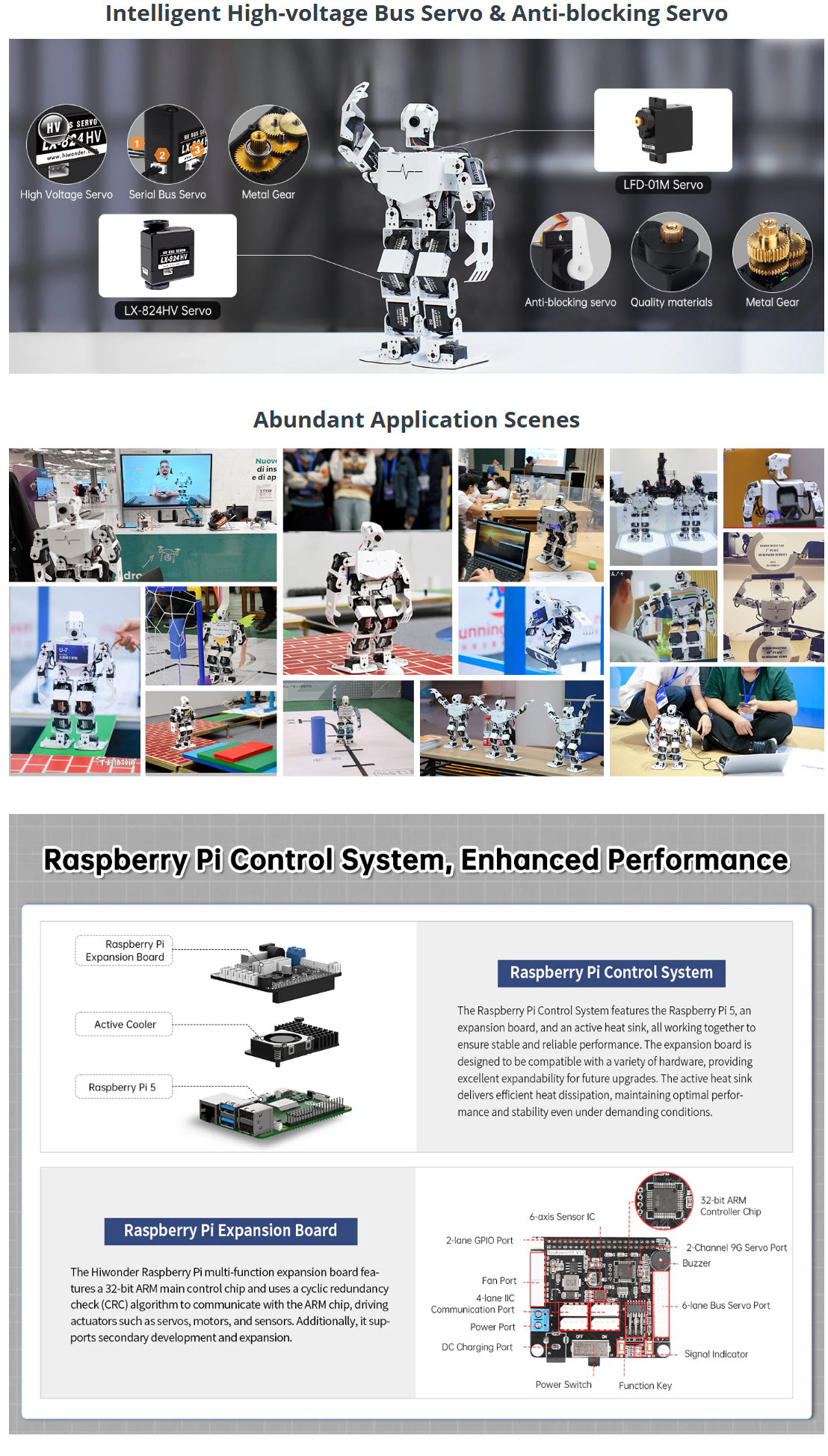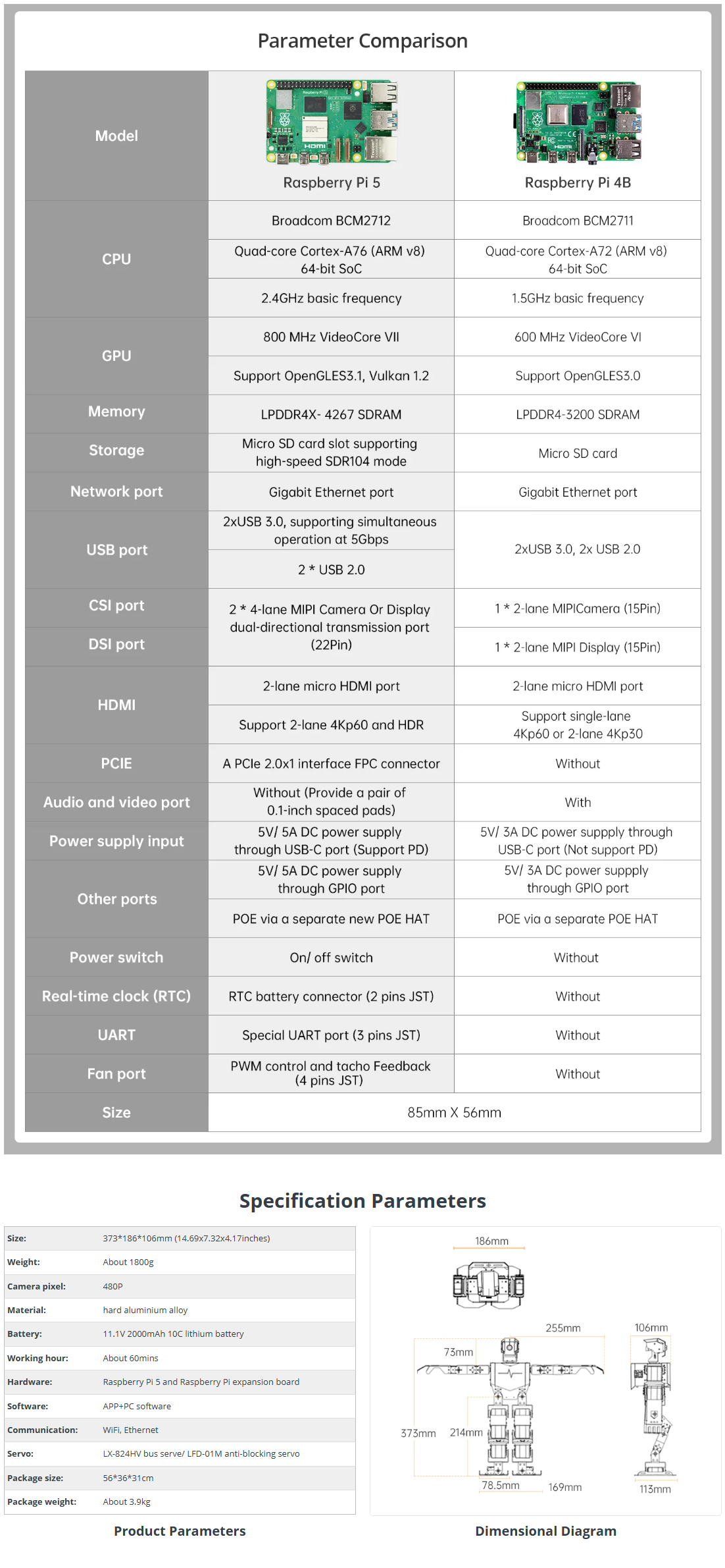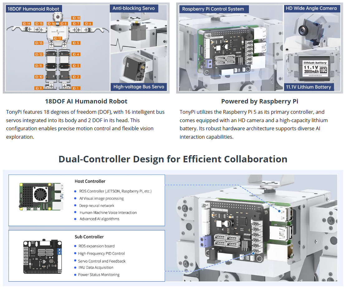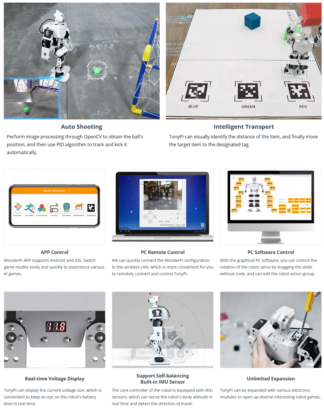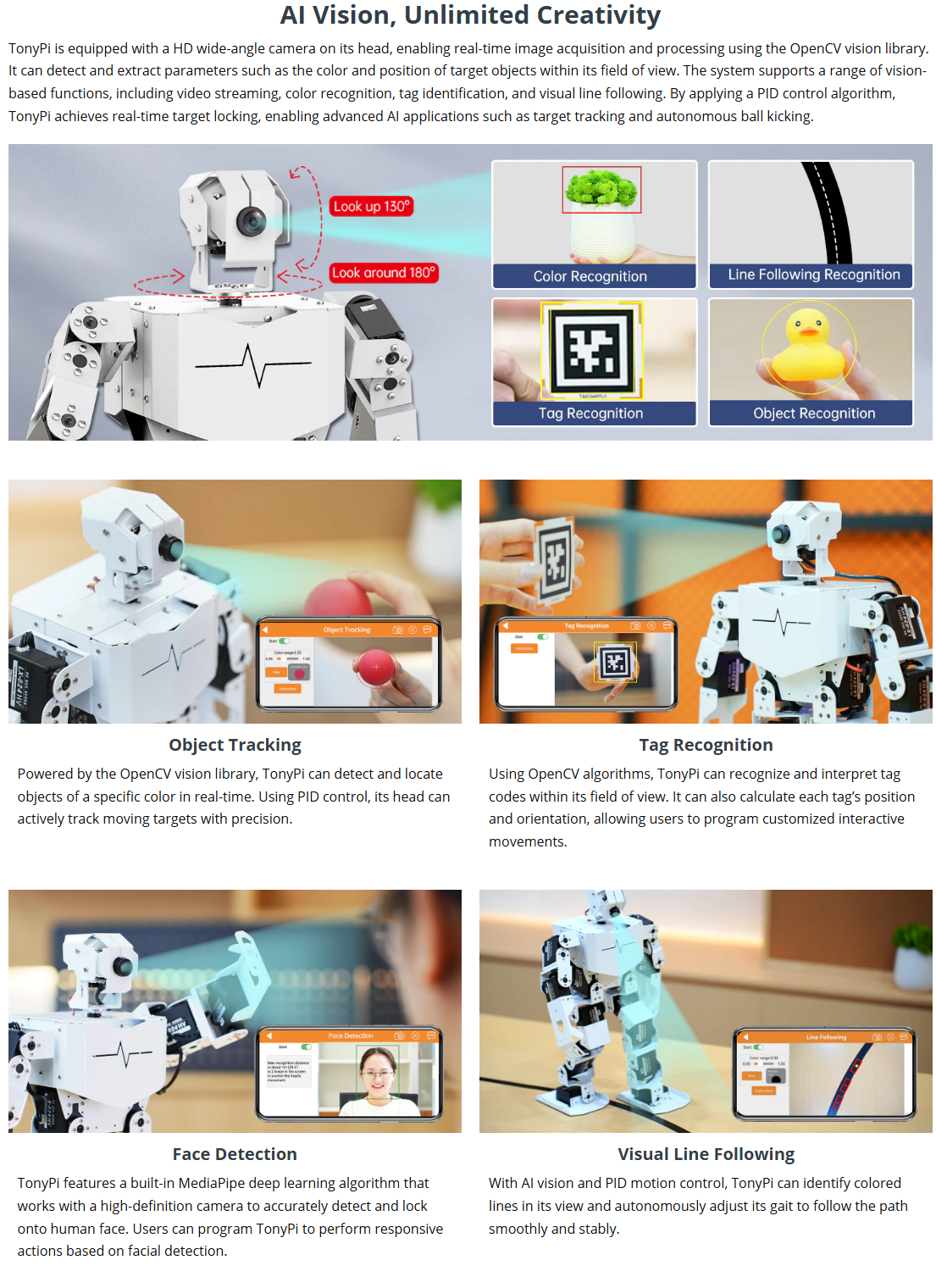 【Al-Driven and Raspberry Pi Powered】 TonyPi is a high-performance AI vision robot designed for AI education applications. It is powered by the Raspberry Pi 5, integrated with an OpenCV image processing library and robotic inverse kinematics algorithms. Offering open-source access, TonyPi provides a flexible development environment that supports advanced AI robotics development.