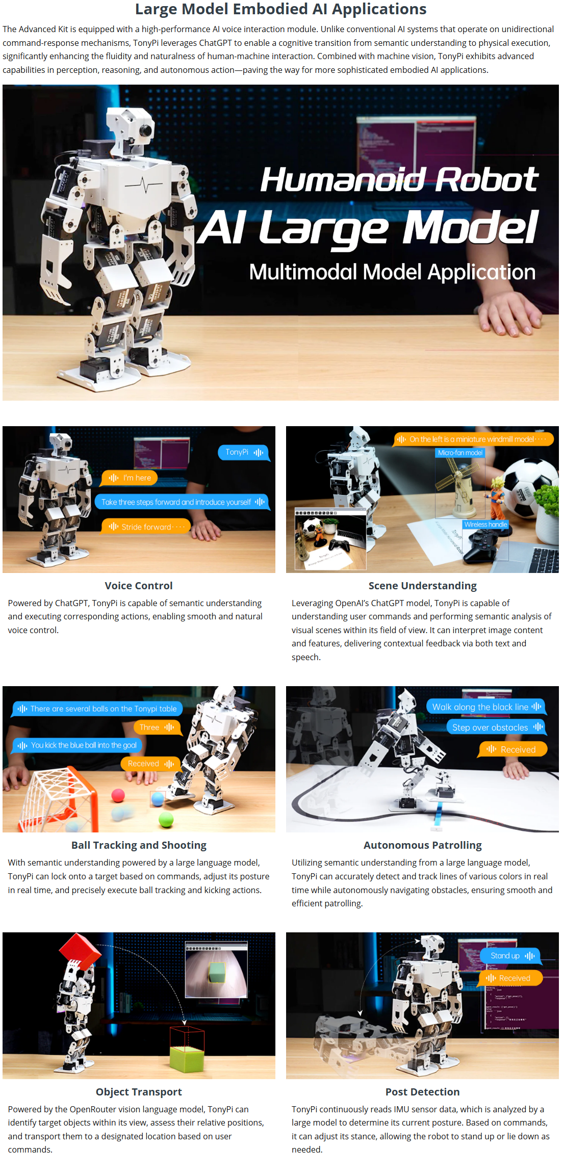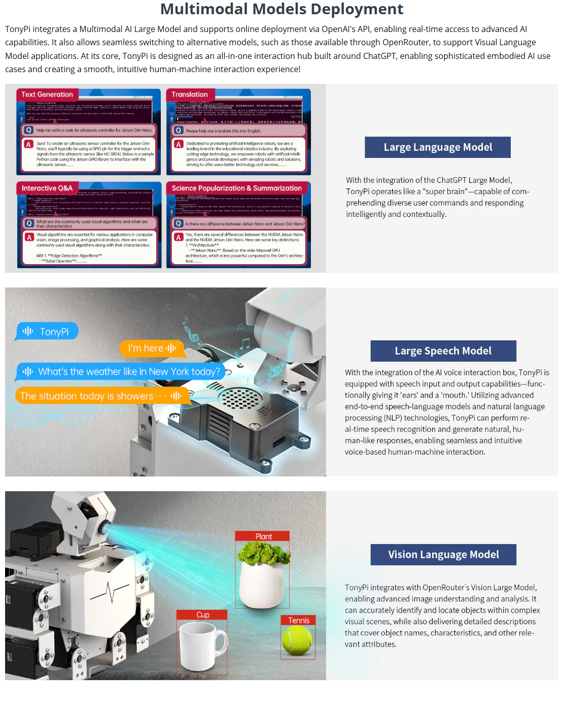 TonyPi also leverages a Multimodal AI Large Model to support more advanced embodied AI applications. To help you unlock its full potential, we offer comprehensive tutorials designed to inspire and support your AI-driven creative projects.