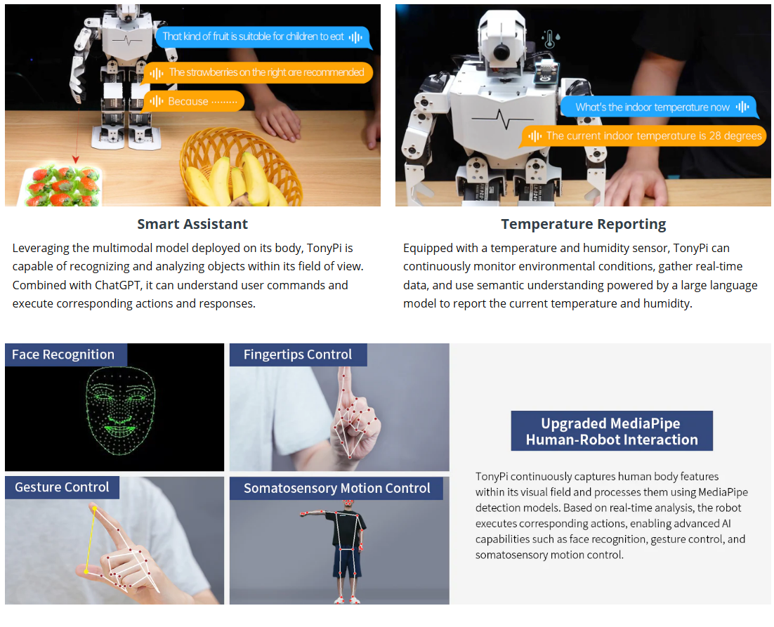 【AI Large Model Integration for Enhanced Human-Machine Interaction】 TonyPi incorporates a multimodal model, with ChatGPT at the core of its interaction system. Coupled with AI vision, TonyPi excels in perception, reasoning, and action, enabling advanced embodied AI applications and delivering a seamless, intuitive human-machine interaction experience!