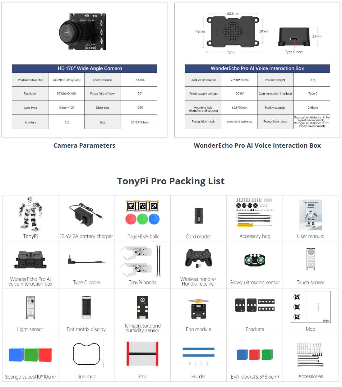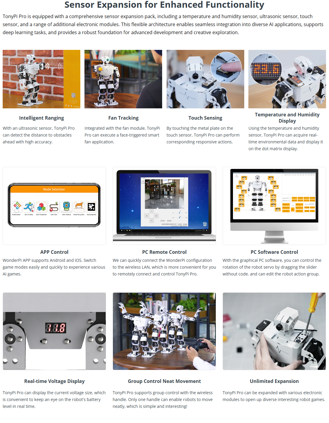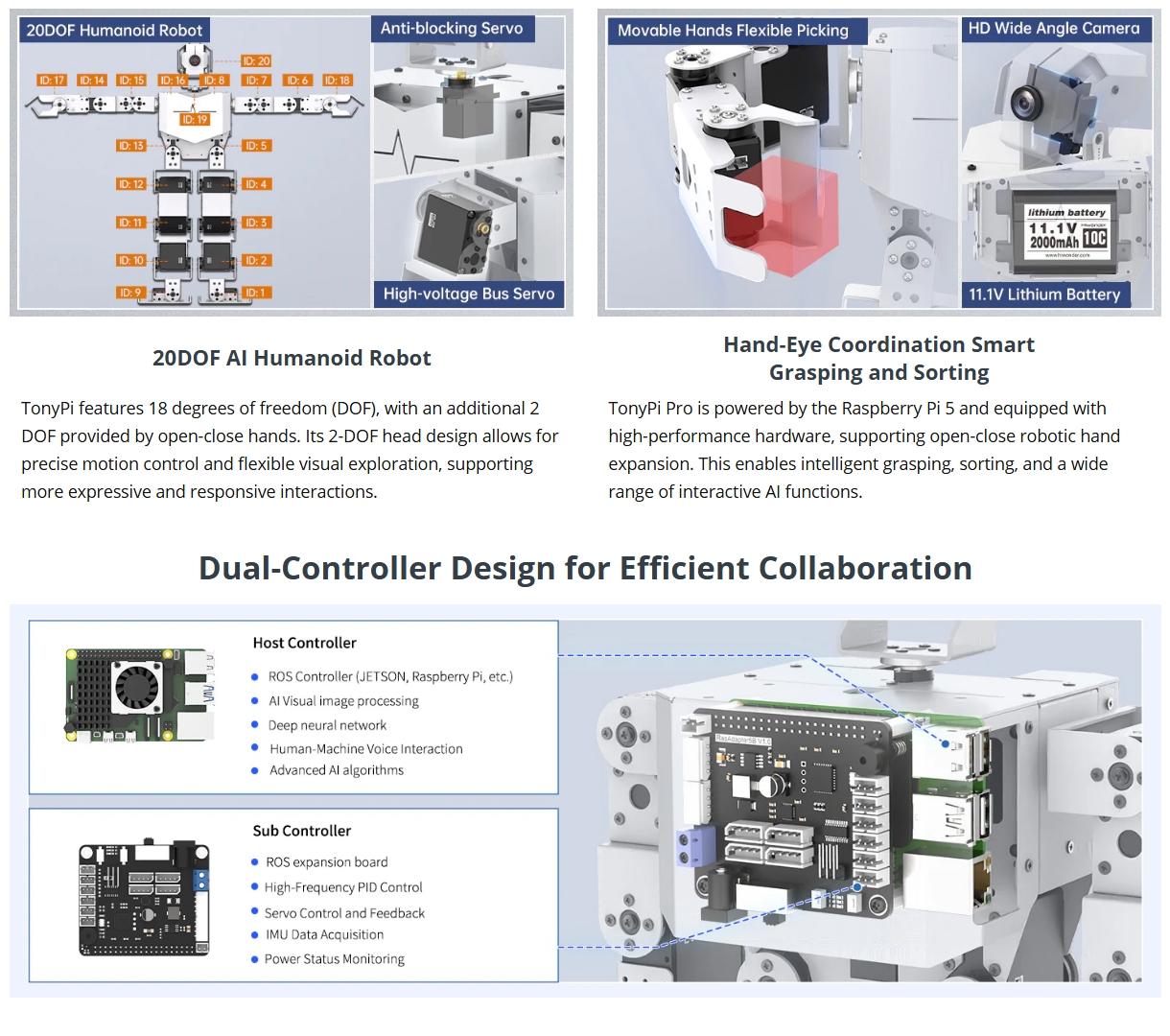 • Al-Driven and Raspberry Pi Powered: TonyPi Pro is a high-performance AI vision robot designed for AI education applications. It is powered by the Raspberry Pi 5, integrated with an OpenCV image processing library and robotic inverse kinematics algorithms. Offering open-source access, TonyPi Pro provides a flexible development environment that supports advanced AI robotics development.