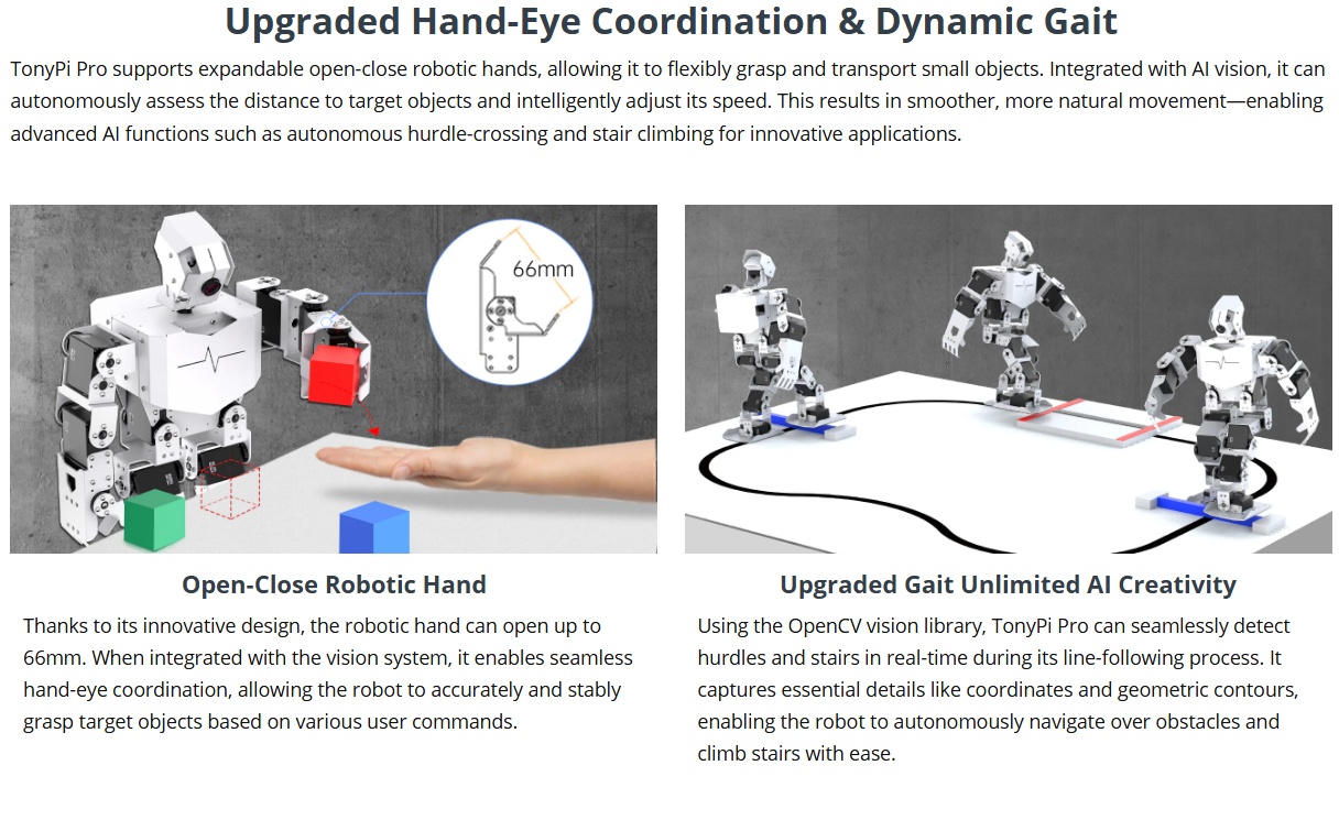 • Upgraded Hand-Eye Coordination & Dynamic Gait: TonyPi Pro features enhanced open-close robotic hands and AI-powered vision, allowing it to grasp and transport objects with greater flexibility. Its advanced gait system supports a wider range of motion, enabling tasks like autonomous hurdle-crossing and stair climbing—ideal for exploring creative AI applications.