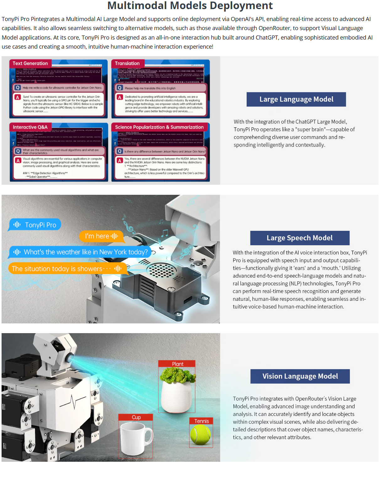 • AI Large Model Integration for Enhanced Human-Machine Interaction: TonyPi Pro incorporates a multimodal model, with ChatGPT at the core of its interaction system. Coupled with AI vision, TonyPi Pro excels in perception, reasoning, and action, enabling advanced embodied AI applications and delivering a seamless, intuitive human-machine interaction experience!