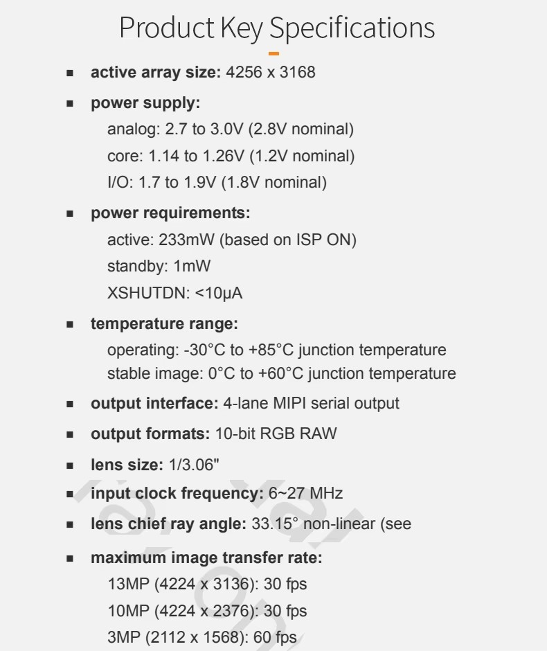 - Active pixels: 13MP 4224(H)x3136 (V)