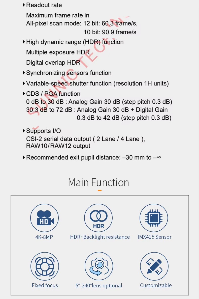 - Sensor: Sony IMX415(1/2.8″)CMOS
