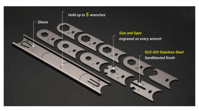 The Mininch WrenchIt offers a versatile, easy-to-carry wrench solution for any utility job. It has a flat, innovative design that stores five wrenches in the handle and slides them into place when needed. Item includes five additional wrench sizes and a convenient nylon carry pouch. The WrenchIt is constructed from stainless steel with a durable matte finish.