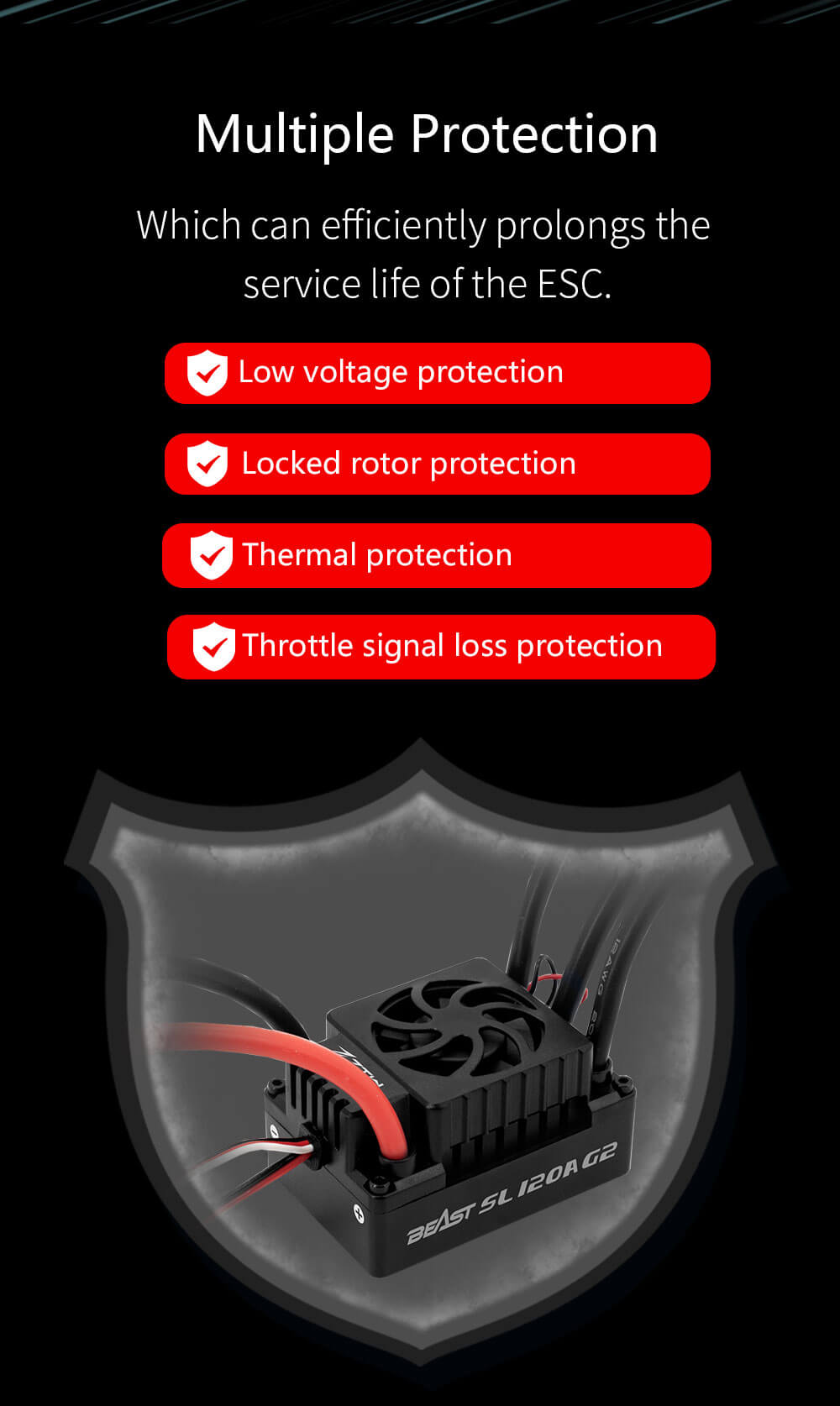 - Comprehensive Protection: Built-in safeguards, including low-voltage cutoff (LVC), over-temperature protection, and throttle signal loss protection, to shield your ESC and motor from damage.