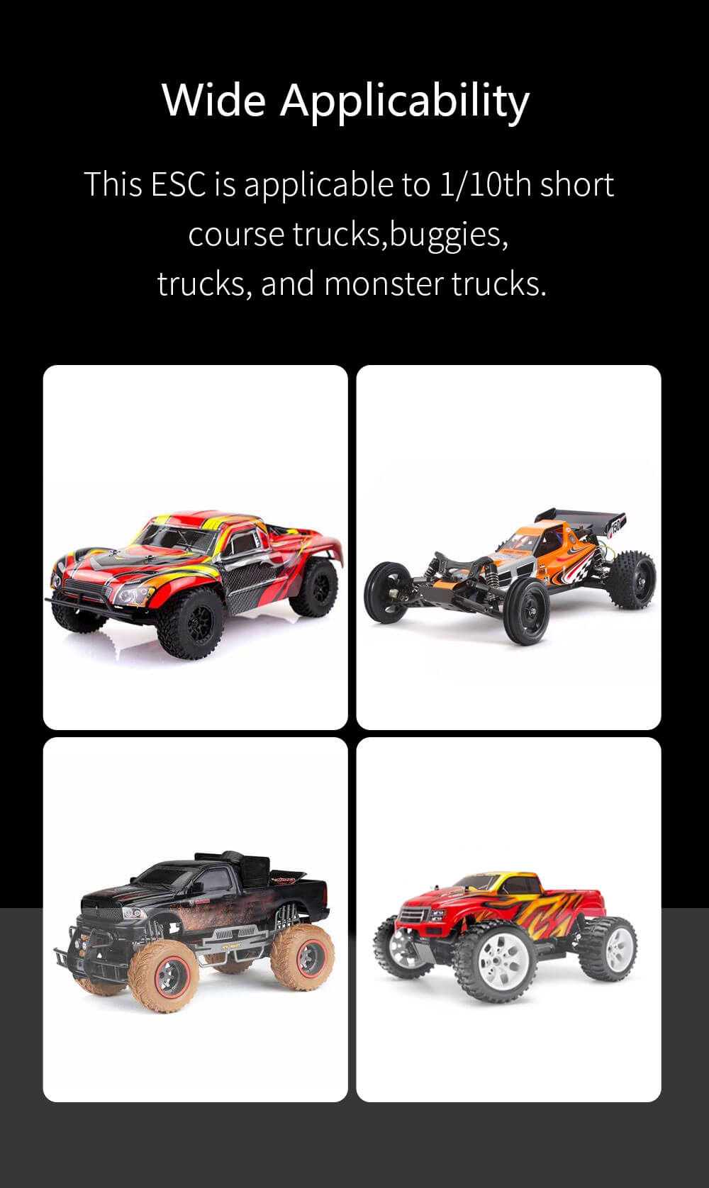 Compatible With: Ideal for 1/10 Scale RC Cars, Trucks, Buggies. Short Course Truck(SCT) models require a 120A ESC upgrade.