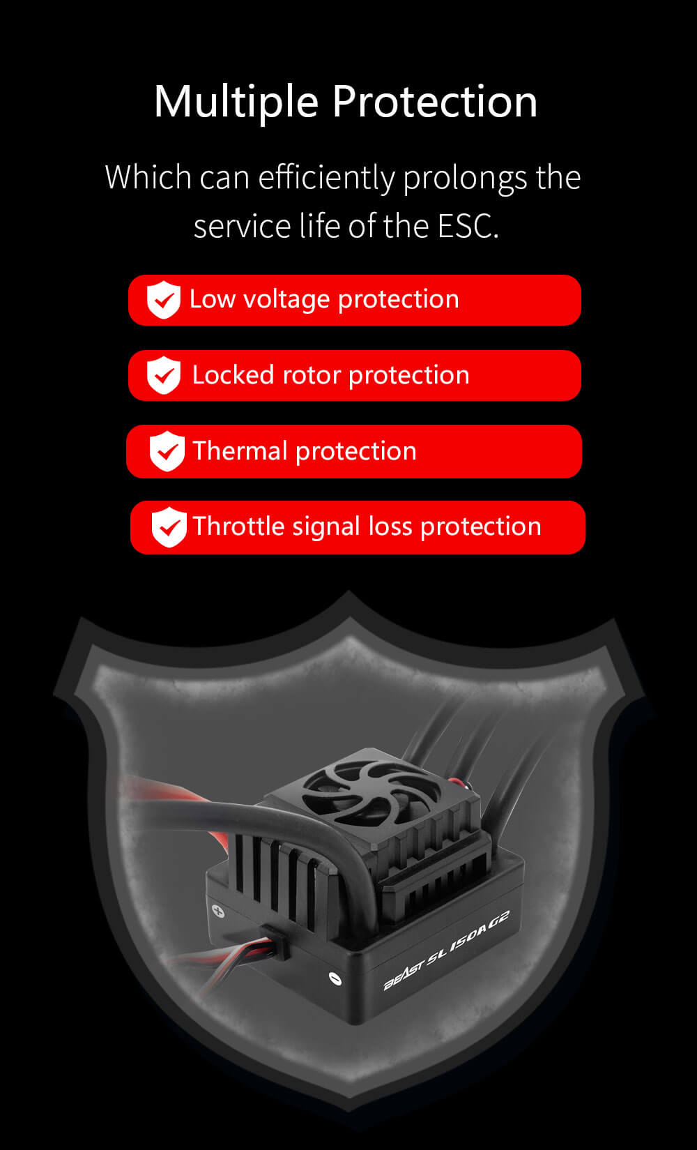 - Comprehensive Protection: Built-in safeguards, including low-voltage cutoff (LVC), over-temperature protection, and throttle signal loss protection, to shield your ESC and motor from damage.
