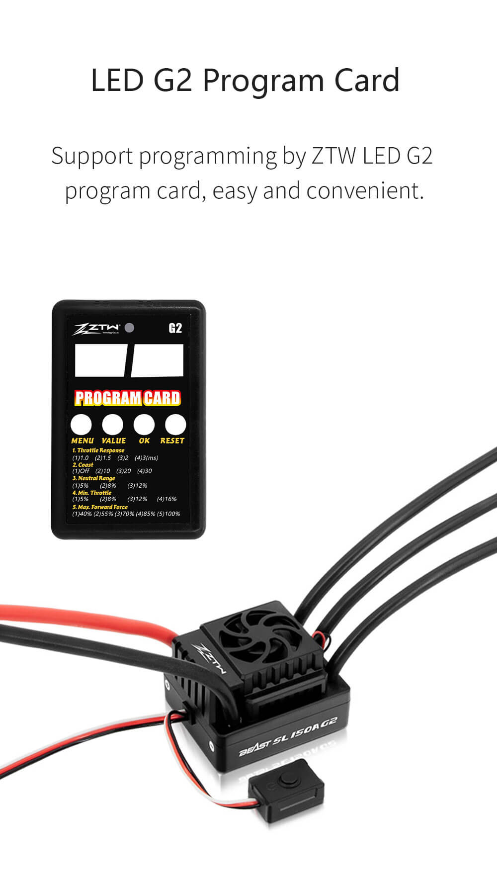 Engineered for the serious RC enthusiast, the ZTW Beast G2 SL 150A Electronic Speed Controller is the heart of your 1/8 scale vehicle’s power system. Designed for sensorless brushless motors, this compact powerhouse delivers smooth, reliable throttle response and robust performance on various terrains.