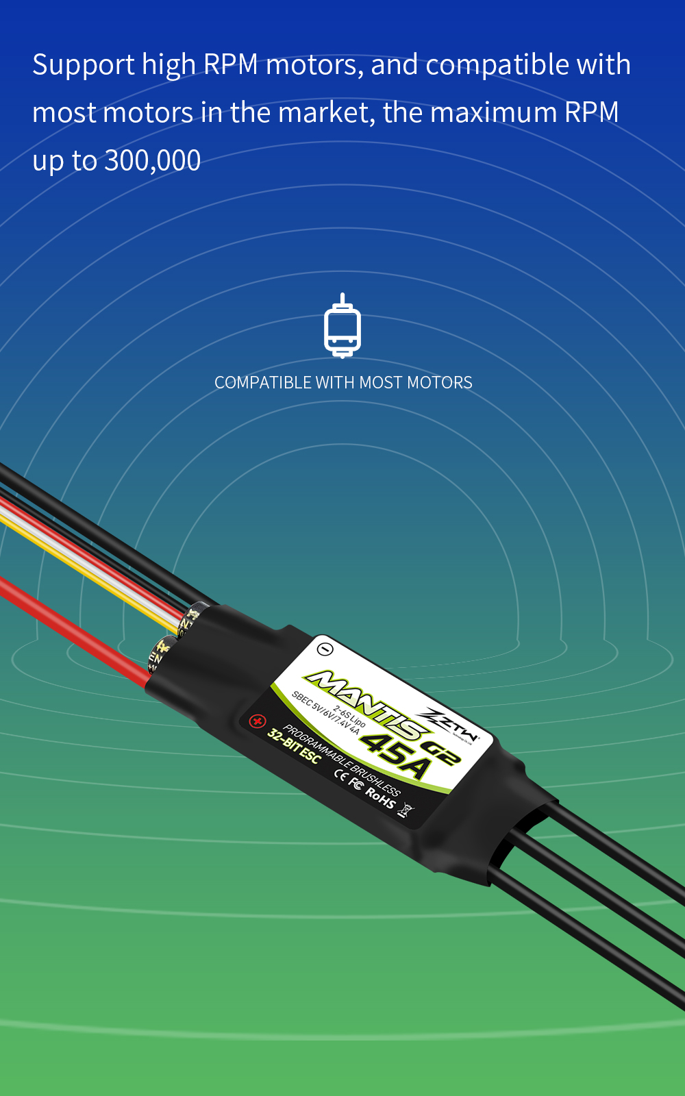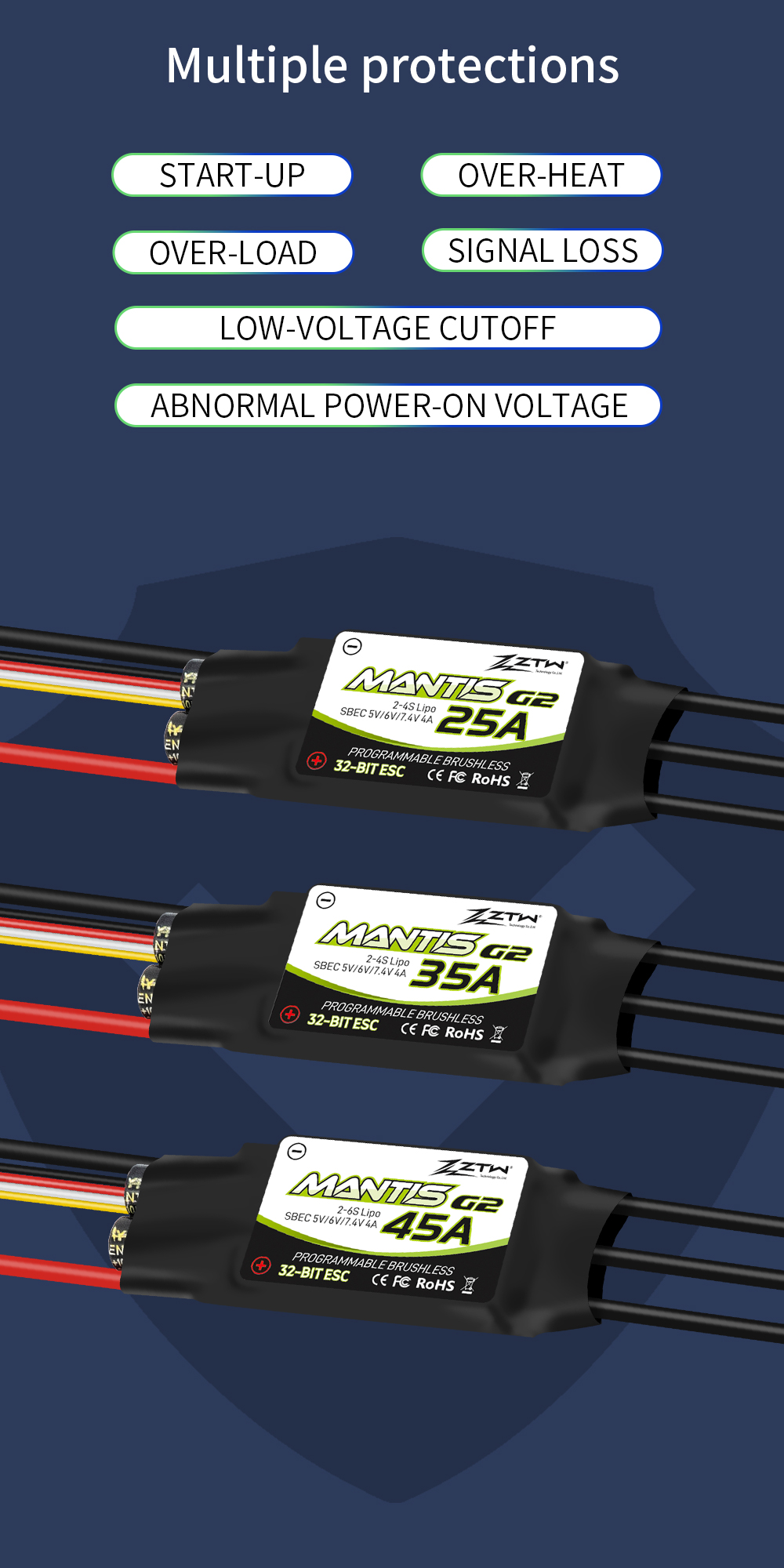 - Comprehensive Protection & Easy Programming: Built with multiple safeguards, including Low Voltage Cutoff (LVC) and Over-Heat Protection, to ensure the longevity of your electronics. Key settings such as brake and BEC voltages can be easily customized using the ZTW LCD programming card (sold separately) to optimize performance.