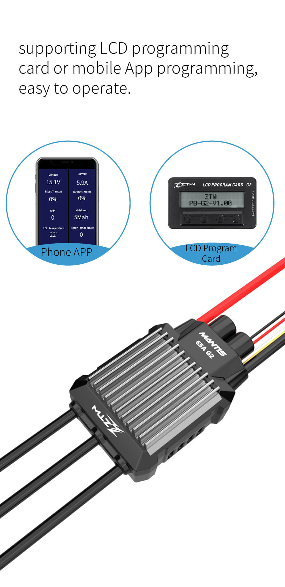 The ZTW Mantis G2 65A ESC is engineered to deliver robust and consistent power for your medium to large-scale RC airplanes and EDF jets. With its advanced switching BEC and comprehensive protection features, it ensures exceptional performance and reliability during demanding flights.