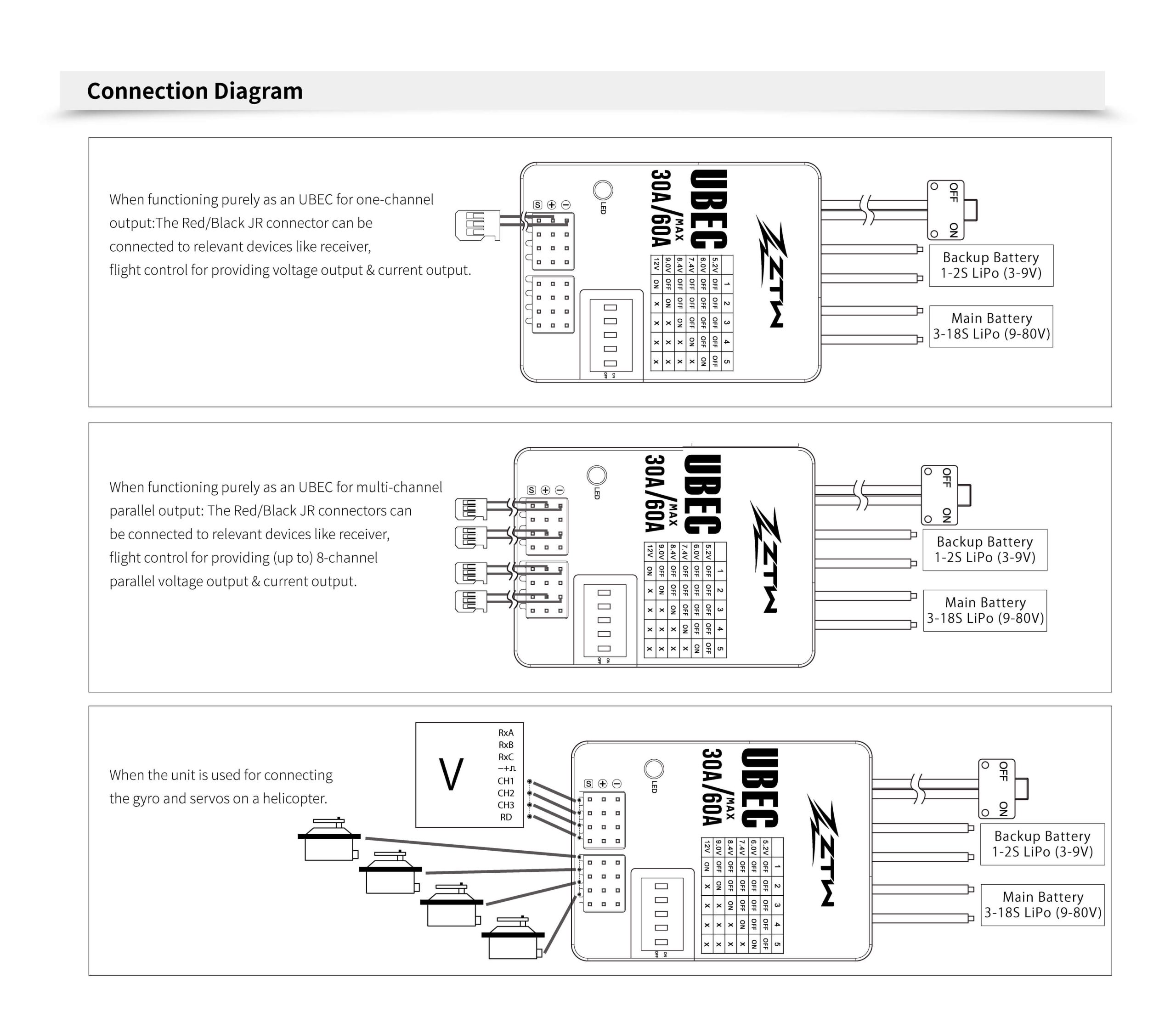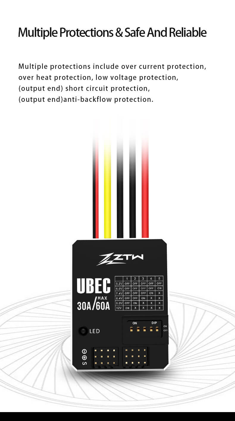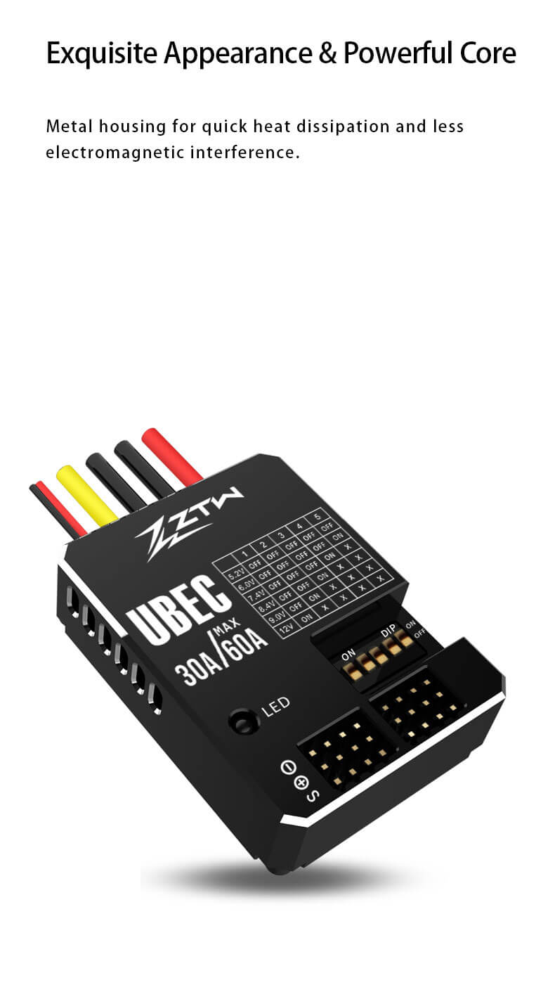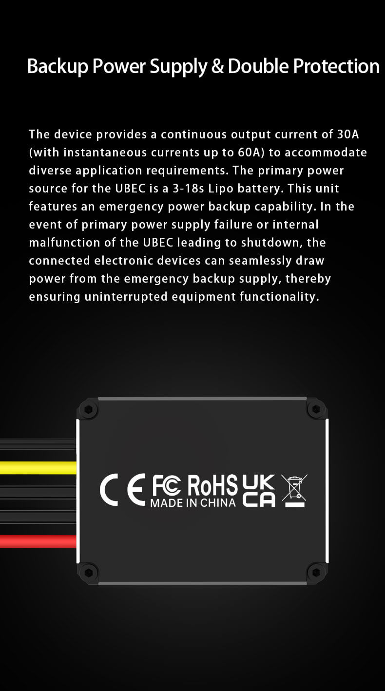- High Current & Parallel Outputs: Experience unparalleled power with a continuous 30A (60A peak) output. Featuring 8-channel parallel outputs, this UBEC effortlessly supports multiple high-torque servos and demanding electronic systems in large-scale RC models, ensuring stable power under extreme loads.