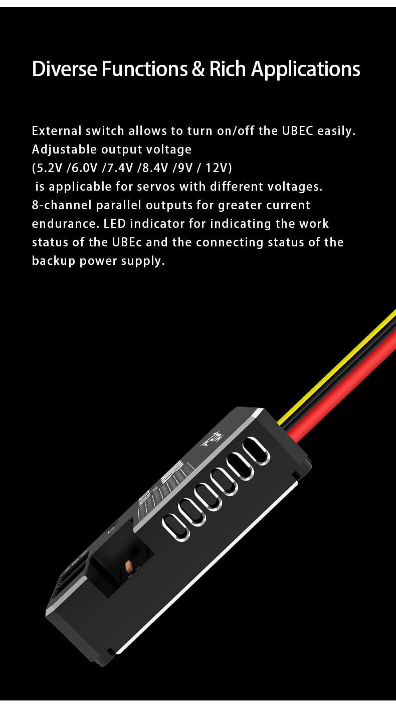- Wide-Voltage Input & Adjustable Output: Compatible with a broad range of 3-18S LiPo batteries (9-80V), ideal for high-voltage setups. The precisely adjustable output voltage (5.2V/6.0V/7.4V/8.4V/9V/12V) allows you to perfectly match the requirements of various servos and other onboard equipment.